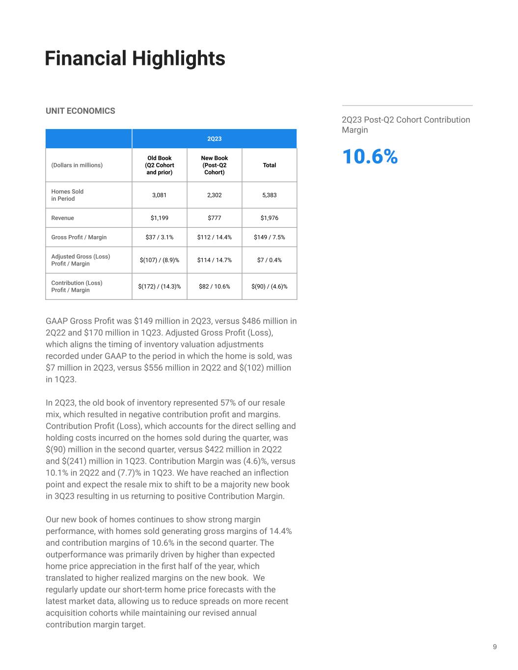 Our second quarter results reflect progress in selling through our longest-held homes while continuing to build into a new book of healthy inventory. We remain focused on delivering healthy, risk-adjusted contribution margins and preserving capital through disciplined cost management. GROWTH In the second quarter, we delivered $2.0 billion of revenue, exceeding the high end of our revenue guidance by 7%. By quarter end, 99% of our Q2 cohort1 was sold or under resale contract, of which only 1% was under resale contract. As expected, volumes declined sequentially by 35% from 1Q23 given the run-off of the old book. Given the uncertainty in the housing market, we have been operating with elevated spreads since June of last year. While critical from a risk management perspective, higher spreads impact volumes. We purchased 2,680 homes in 2Q23, which is 81% lower than 2Q22. We reduced spreads between 1Q23 and 2Q23 to reflect pricing model improvements related to home condition, reduced holding and selling costs due to shorter expected holding times, and an improvement in our view of home prices in the back half of 2023. Even though spreads are still elevated, the reduction translated through to a 53% increase in acquisition volumes between 1Q23 and 2Q23, despite a 43% reduction in paid marketing and overall lower market new listing volumes during the same period. We plan to continue to operate with elevated spreads and for acquisition volumes to pace at roughly 3,000 homes per quarter through the end of the year. Our expanded partnership channels should mitigate typical seasonal market volume declines in the second half of the year. In the fourth quarter, we expect to be able to reduce spreads due to typical home price seasonality, which would accelerate acquisitions in the first quarter of 2024, coinciding with improving market volumes. This will allow us to increase cost-effective investments in paid marketing. These factors, combined with the accruing benefits of our partnership channels, will drive higher volumes and ultimately allow us to rescale the business. 8 Financial Highlights Revenue $2.0 billion Homes Sold 5,383 7,512 10,482 8,520 5,383 8,274 2Q22 3Q22 4Q22 1Q23 2Q23 $2.9 $4.2 $3.4 $2.0 $3.1 2Q22 3Q22 4Q22 1Q23 2Q23 1. Homes we made offers on between March and June of 2022.