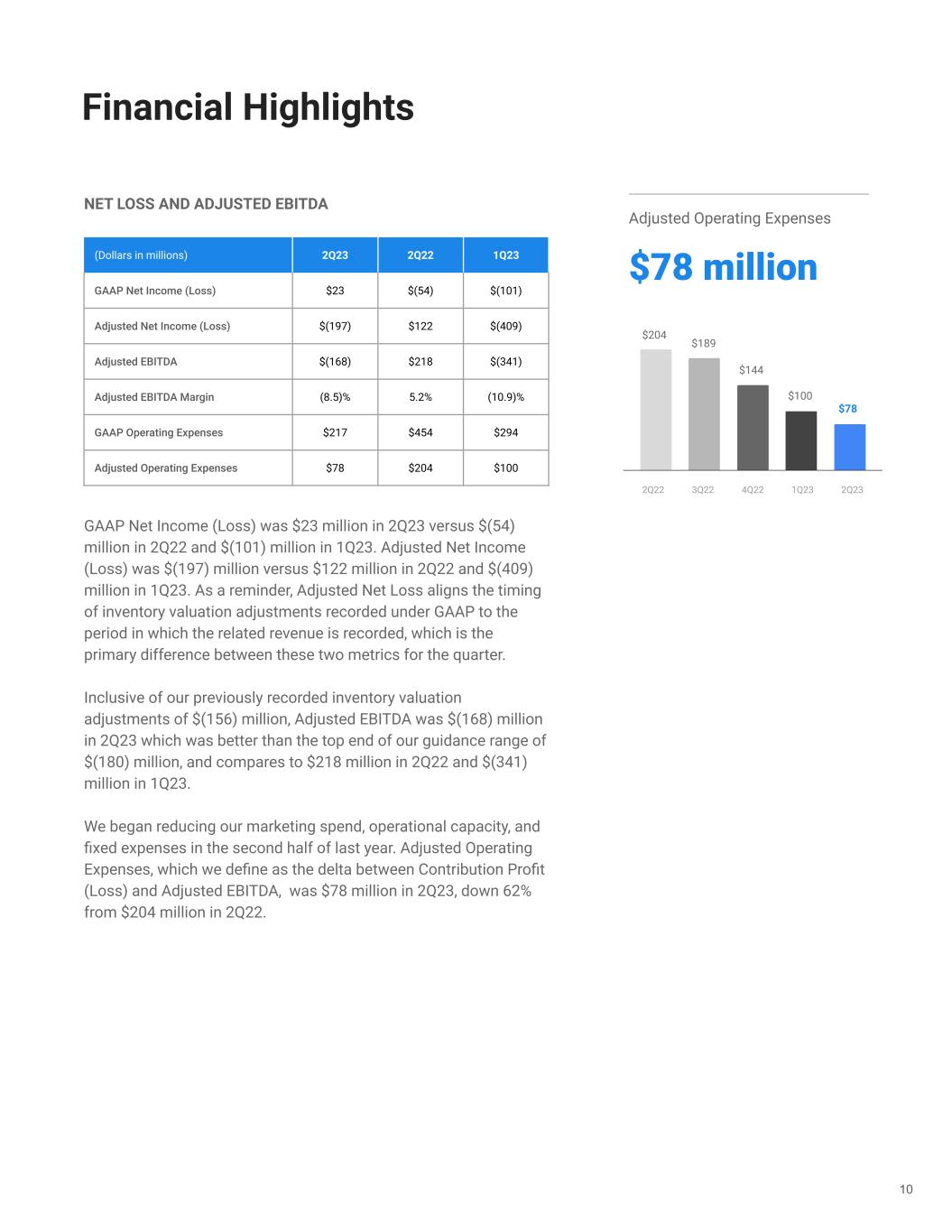 NET LOSS AND ADJUSTED EBITDA GAAP Net Income (Loss) was $23 million in 2Q23 versus $(54) million in 2Q22 and $(101) million in 1Q23. Adjusted Net Income (Loss) was $(197) million versus $122 million in 2Q22 and $(409) million in 1Q23. As a reminder, Adjusted Net Loss aligns the timing of inventory valuation adjustments recorded under GAAP to the period in which the related revenue is recorded, which is the primary difference between these two metrics for the quarter. Inclusive of our previously recorded inventory valuation adjustments of $(156) million, Adjusted EBITDA was $(168) million in 2Q23 which was better than the top end of our guidance range of $(180) million, and compares to $218 million in 2Q22 and $(341) million in 1Q23. We began reducing our marketing spend, operational capacity, and fixed expenses in the second half of last year. Adjusted Operating Expenses, which we define as the delta between Contribution Profit (Loss) and Adjusted EBITDA, was $78 million in 2Q23, down 62% from $204 million in 2Q22. 10 Financial Highlights (Dollars in millions) 2Q23 2Q22 1Q23 GAAP Net Income (Loss) $23 $(54) $(101) Adjusted Net Income (Loss) $(197) $122 $(409) Adjusted EBITDA $(168) $218 $(341) Adjusted EBITDA Margin (8.5)% 5.2% (10.9)% GAAP Operating Expenses $217 $454 $294 Adjusted Operating Expenses $78 $204 $100 Adjusted Operating Expenses $78 million $144 $204 $189 $78 $100 2Q22 3Q22 4Q22 1Q23 2Q23