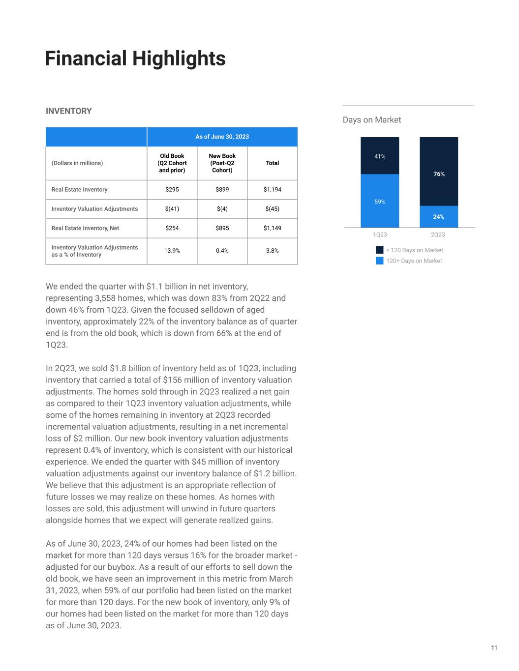 11 Financial Highlights Days on Market INVENTORY We ended the quarter with $1.1 billion in net inventory, representing 3,558 homes, which was down 83% from 2Q22 and down 46% from 1Q23. Given the focused selldown of aged inventory, approximately 22% of the inventory balance as of quarter end is from the old book, which is down from 66% at the end of 1Q23. In 2Q23, we sold $1.8 billion of inventory held as of 1Q23, including inventory that carried a total of $156 million of inventory valuation adjustments. The homes sold through in 2Q23 realized a net gain as compared to their 1Q23 inventory valuation adjustments, while some of the homes remaining in inventory at 2Q23 recorded incremental valuation adjustments, resulting in a net incremental loss of $2 million. Our new book inventory valuation adjustments represent 0.4% of inventory, which is consistent with our historical experience. We ended the quarter with $45 million of inventory valuation adjustments against our inventory balance of $1.2 billion. We believe that this adjustment is an appropriate reflection of future losses we may realize on these homes. As homes with losses are sold, this adjustment will unwind in future quarters alongside homes that we expect will generate realized gains. As of June 30, 2023, 24% of our homes had been listed on the market for more than 120 days versus 16% for the broader market - adjusted for our buybox. As a result of our efforts to sell down the old book, we have seen an improvement in this metric from March 31, 2023, when 59% of our portfolio had been listed on the market for more than 120 days. For the new book of inventory, only 9% of our homes had been listed on the market for more than 120 days as of June 30, 2023. As of June 30, 2023 (Dollars in millions) Old Book (Q2 Cohort and prior) New Book (Post-Q2 Cohort) Total Real Estate Inventory $295 $899 $1,194 Inventory Valuation Adjustments $(41) $(4) $(45) Real Estate Inventory, Net $254 $895 $1,149 Inventory Valuation Adjustments as a % of Inventory 13.9% 0.4% 3.8% 76% 24% 59% 41% 1Q23 2Q23 < 120 Days on Market 120+ Days on Market