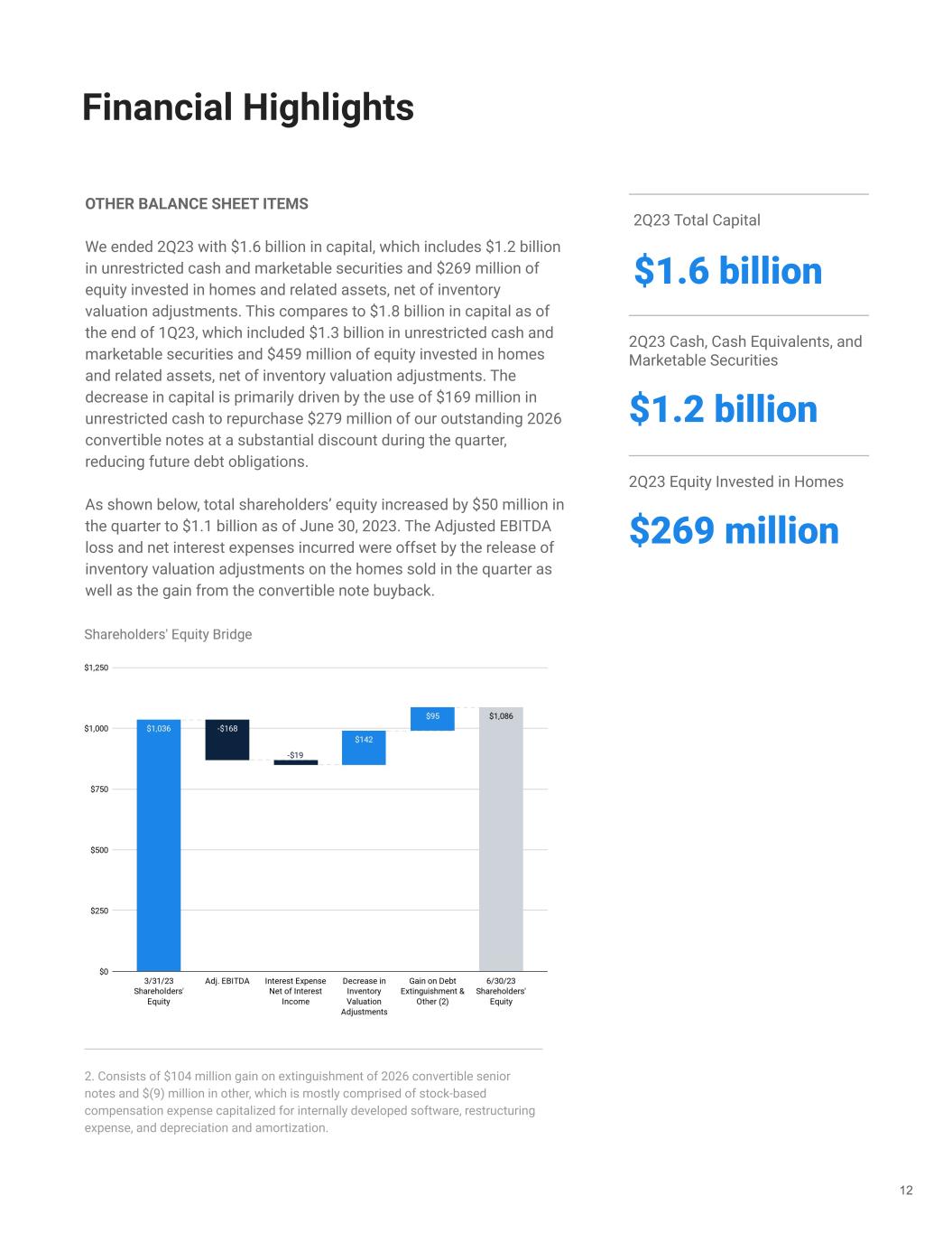 Financial Highlights OTHER BALANCE SHEET ITEMS We ended 2Q23 with $1.6 billion in capital, which includes $1.2 billion in unrestricted cash and marketable securities and $269 million of equity invested in homes and related assets, net of inventory valuation adjustments. This compares to $1.8 billion in capital as of the end of 1Q23, which included $1.3 billion in unrestricted cash and marketable securities and $459 million of equity invested in homes and related assets, net of inventory valuation adjustments. The decrease in capital is primarily driven by the use of $169 million in unrestricted cash to repurchase $279 million of our outstanding 2026 convertible notes at a substantial discount during the quarter, reducing future debt obligations. As shown below, total shareholders’ equity increased by $50 million in the quarter to $1.1 billion as of June 30, 2023. The Adjusted EBITDA loss and net interest expenses incurred were offset by the release of inventory valuation adjustments on the homes sold in the quarter as well as the gain from the convertible note buyback. 12 2Q23 Total Capital $1.6 billion 2Q23 Cash, Cash Equivalents, and Marketable Securities $1.2 billion 2Q23 Equity Invested in Homes $269 million 2. Consists of $104 million gain on extinguishment of 2026 convertible senior notes and $(9) million in other, which is mostly comprised of stock-based compensation expense capitalized for internally developed software, restructuring expense, and depreciation and amortization.