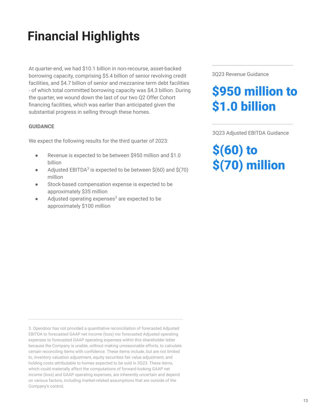 Financial Highlights 13 At quarter-end, we had $10.1 billion in non-recourse, asset-backed borrowing capacity, comprising $5.4 billion of senior revolving credit facilities, and $4.7 billion of senior and mezzanine term debt facilities - of which total committed borrowing capacity was $4.3 billion. During the quarter, we wound down the last of our two Q2 Offer Cohort financing facilities, which was earlier than anticipated given the substantial progress in selling through these homes. GUIDANCE We expect the following results for the third quarter of 2023: ● Revenue is expected to be between $950 million and $1.0 billion ● Adjusted EBITDA3 is expected to be between $(60) and $(70) million ● Stock-based compensation expense is expected to be approximately $35 million ● Adjusted operating expenses3 are expected to be approximately $100 million 3. Opendoor has not provided a quantitative reconciliation of forecasted Adjusted EBITDA to forecasted GAAP net income (loss) nor forecasted Adjusted operating expenses to forecasted GAAP operating expenses within this shareholder letter because the Company is unable, without making unreasonable efforts, to calculate certain reconciling items with confidence. These items include, but are not limited to, inventory valuation adjustment, equity securities fair value adjustment, and holding costs attributable to homes expected to be sold in 3Q23. These items, which could materially affect the computations of forward-looking GAAP net income (loss) and GAAP operating expenses, are inherently uncertain and depend on various factors, including market-related assumptions that are outside of the Company’s control. 3Q23 Revenue Guidance $950 million to $1.0 billion 3Q23 Adjusted EBITDA Guidance $(60) to $(70) million