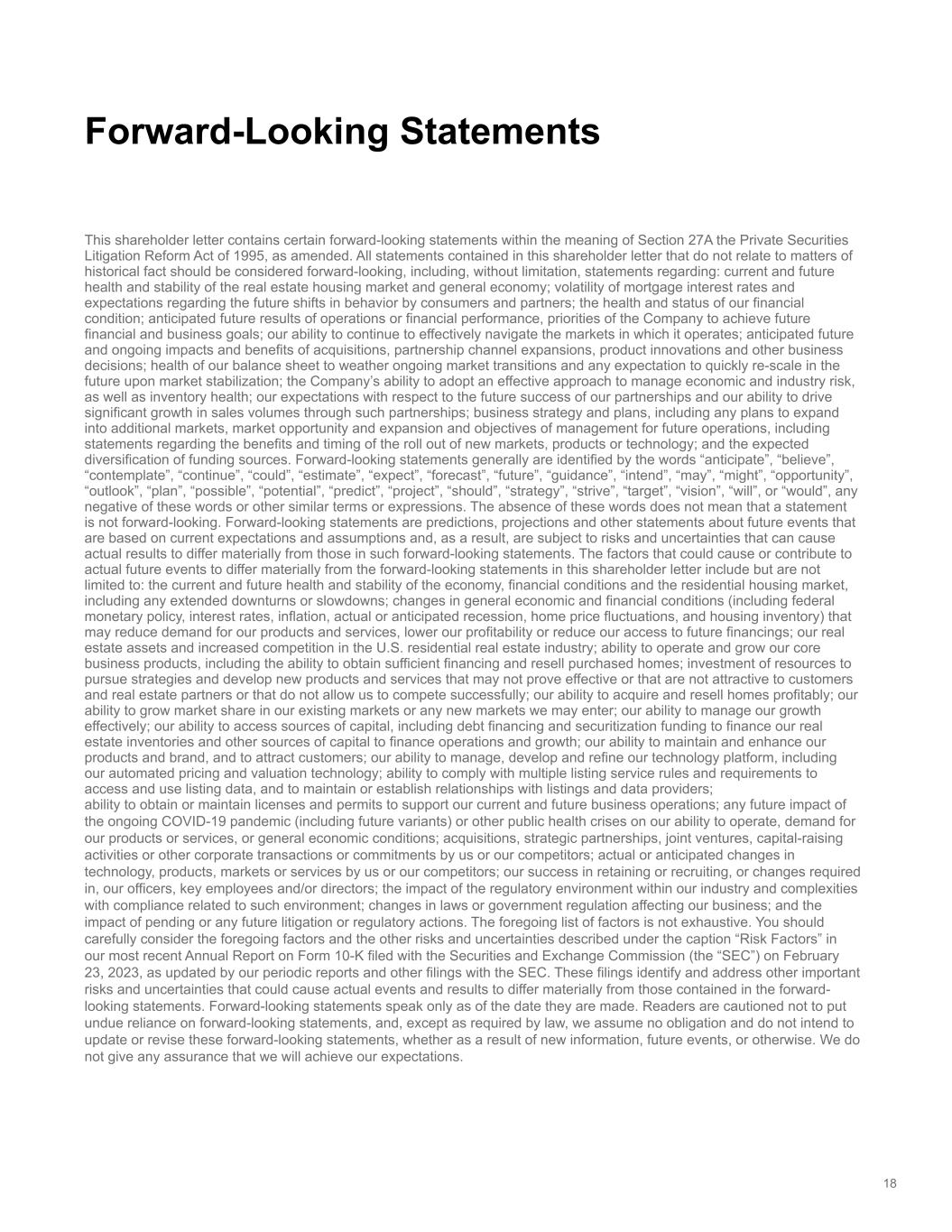 This shareholder letter contains certain forward-looking statements within the meaning of Section 27A the Private Securities Litigation Reform Act of 1995, as amended. All statements contained in this shareholder letter that do not relate to matters of historical fact should be considered forward-looking, including, without limitation, statements regarding: current and future health and stability of the real estate housing market and general economy; volatility of mortgage interest rates and expectations regarding the future shifts in behavior by consumers and partners; the health and status of our financial condition; anticipated future results of operations or financial performance, priorities of the Company to achieve future financial and business goals; our ability to continue to effectively navigate the markets in which it operates; anticipated future and ongoing impacts and benefits of acquisitions, partnership channel expansions, product innovations and other business decisions; health of our balance sheet to weather ongoing market transitions and any expectation to quickly re-scale in the future upon market stabilization; the Company’s ability to adopt an effective approach to manage economic and industry risk, as well as inventory health; our expectations with respect to the future success of our partnerships and our ability to drive significant growth in sales volumes through such partnerships; business strategy and plans, including any plans to expand into additional markets, market opportunity and expansion and objectives of management for future operations, including statements regarding the benefits and timing of the roll out of new markets, products or technology; and the expected diversification of funding sources. Forward-looking statements generally are identified by the words “anticipate”, “believe”, “contemplate”, “continue”, “could”, “estimate”, “expect”, “forecast”, “future”, “guidance”, “intend”, “may”, “might”, “opportunity”, “outlook”, “plan”, “possible”, “potential”, “predict”, “project”, “should”, “strategy”, “strive”, “target”, “vision”, “will”, or “would”, any negative of these words or other similar terms or expressions. The absence of these words does not mean that a statement is not forward-looking. Forward-looking statements are predictions, projections and other statements about future events that are based on current expectations and assumptions and, as a result, are subject to risks and uncertainties that can cause actual results to differ materially from those in such forward-looking statements. The factors that could cause or contribute to actual future events to differ materially from the forward-looking statements in this shareholder letter include but are not limited to: the current and future health and stability of the economy, financial conditions and the residential housing market, including any extended downturns or slowdowns; changes in general economic and financial conditions (including federal monetary policy, interest rates, inflation, actual or anticipated recession, home price fluctuations, and housing inventory) that may reduce demand for our products and services, lower our profitability or reduce our access to future financings; our real estate assets and increased competition in the U.S. residential real estate industry; ability to operate and grow our core business products, including the ability to obtain sufficient financing and resell purchased homes; investment of resources to pursue strategies and develop new products and services that may not prove effective or that are not attractive to customers and real estate partners or that do not allow us to compete successfully; our ability to acquire and resell homes profitably; our ability to grow market share in our existing markets or any new markets we may enter; our ability to manage our growth effectively; our ability to access sources of capital, including debt financing and securitization funding to finance our real estate inventories and other sources of capital to finance operations and growth; our ability to maintain and enhance our products and brand, and to attract customers; our ability to manage, develop and refine our technology platform, including our automated pricing and valuation technology; ability to comply with multiple listing service rules and requirements to access and use listing data, and to maintain or establish relationships with listings and data providers; ability to obtain or maintain licenses and permits to support our current and future business operations; any future impact of the ongoing COVID-19 pandemic (including future variants) or other public health crises on our ability to operate, demand for our products or services, or general economic conditions; acquisitions, strategic partnerships, joint ventures, capital-raising activities or other corporate transactions or commitments by us or our competitors; actual or anticipated changes in technology, products, markets or services by us or our competitors; our success in retaining or recruiting, or changes required in, our officers, key employees and/or directors; the impact of the regulatory environment within our industry and complexities with compliance related to such environment; changes in laws or government regulation affecting our business; and the impact of pending or any future litigation or regulatory actions. The foregoing list of factors is not exhaustive. You should carefully consider the foregoing factors and the other risks and uncertainties described under the caption “Risk Factors” in our most recent Annual Report on Form 10-K filed with the Securities and Exchange Commission (the “SEC”) on February 23, 2023, as updated by our periodic reports and other filings with the SEC. These filings identify and address other important risks and uncertainties that could cau