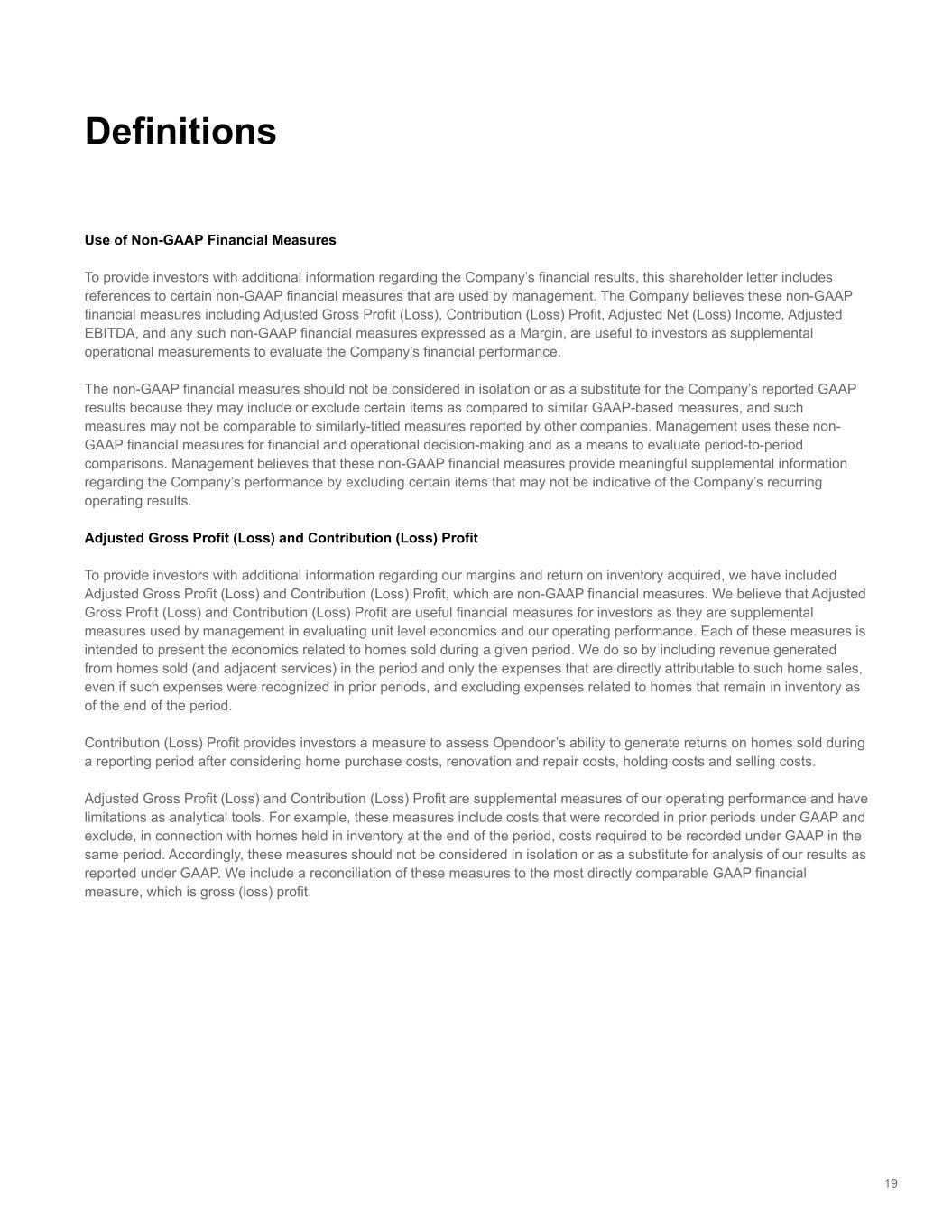 Use of Non-GAAP Financial Measures To provide investors with additional information regarding the Company’s financial results, this shareholder letter includes references to certain non-GAAP financial measures that are used by management. The Company believes these non-GAAP financial measures including Adjusted Gross Profit (Loss), Contribution (Loss) Profit, Adjusted Net (Loss) Income, Adjusted EBITDA, and any such non-GAAP financial measures expressed as a Margin, are useful to investors as supplemental operational measurements to evaluate the Company’s financial performance. The non-GAAP financial measures should not be considered in isolation or as a substitute for the Company’s reported GAAP results because they may include or exclude certain items as compared to similar GAAP-based measures, and such measures may not be comparable to similarly-titled measures reported by other companies. Management uses these non- GAAP financial measures for financial and operational decision-making and as a means to evaluate period-to-period comparisons. Management believes that these non-GAAP financial measures provide meaningful supplemental information regarding the Company’s performance by excluding certain items that may not be indicative of the Company’s recurring operating results. Adjusted Gross Profit (Loss) and Contribution (Loss) Profit To provide investors with additional information regarding our margins and return on inventory acquired, we have included Adjusted Gross Profit (Loss) and Contribution (Loss) Profit, which are non-GAAP financial measures. We believe that Adjusted Gross Profit (Loss) and Contribution (Loss) Profit are useful financial measures for investors as they are supplemental measures used by management in evaluating unit level economics and our operating performance. Each of these measures is intended to present the economics related to homes sold during a given period. We do so by including revenue generated from homes sold (and adjacent services) in the period and only the expenses that are directly attributable to such home sales, even if such expenses were recognized in prior periods, and excluding expenses related to homes that remain in inventory as of the end of the period. Contribution (Loss) Profit provides investors a measure to assess Opendoor’s ability to generate returns on homes sold during a reporting period after considering home purchase costs, renovation and repair costs, holding costs and selling costs. Adjusted Gross Profit (Loss) and Contribution (Loss) Profit are supplemental measures of our operating performance and have limitations as analytical tools. For example, these measures include costs that were recorded in prior periods under GAAP and exclude, in connection with homes held in inventory at the end of the period, costs required to be recorded under GAAP in the same period. Accordingly, these measures should not be considered in isolation or as a substitute for analysis of our results as reported under GAAP. We include a reconciliation of these measures to the most directly comparable GAAP financial measure, which is gross (loss) profit. 19 Definitions