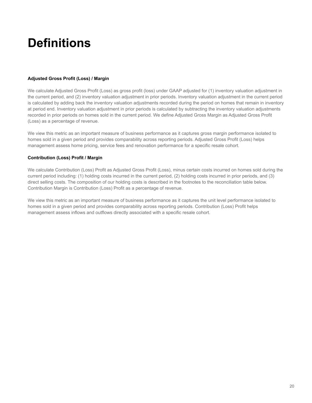 Adjusted Gross Profit (Loss) / Margin We calculate Adjusted Gross Profit (Loss) as gross profit (loss) under GAAP adjusted for (1) inventory valuation adjustment in the current period, and (2) inventory valuation adjustment in prior periods. Inventory valuation adjustment in the current period is calculated by adding back the inventory valuation adjustments recorded during the period on homes that remain in inventory at period end. Inventory valuation adjustment in prior periods is calculated by subtracting the inventory valuation adjustments recorded in prior periods on homes sold in the current period. We define Adjusted Gross Margin as Adjusted Gross Profit (Loss) as a percentage of revenue. We view this metric as an important measure of business performance as it captures gross margin performance isolated to homes sold in a given period and provides comparability across reporting periods. Adjusted Gross Profit (Loss) helps management assess home pricing, service fees and renovation performance for a specific resale cohort. Contribution (Loss) Profit / Margin We calculate Contribution (Loss) Profit as Adjusted Gross Profit (Loss), minus certain costs incurred on homes sold during the current period including: (1) holding costs incurred in the current period, (2) holding costs incurred in prior periods, and (3) direct selling costs. The composition of our holding costs is described in the footnotes to the reconciliation table below. Contribution Margin is Contribution (Loss) Profit as a percentage of revenue. We view this metric as an important measure of business performance as it captures the unit level performance isolated to homes sold in a given period and provides comparability across reporting periods. Contribution (Loss) Profit helps management assess inflows and outflows directly associated with a specific resale cohort. 20 Definitions