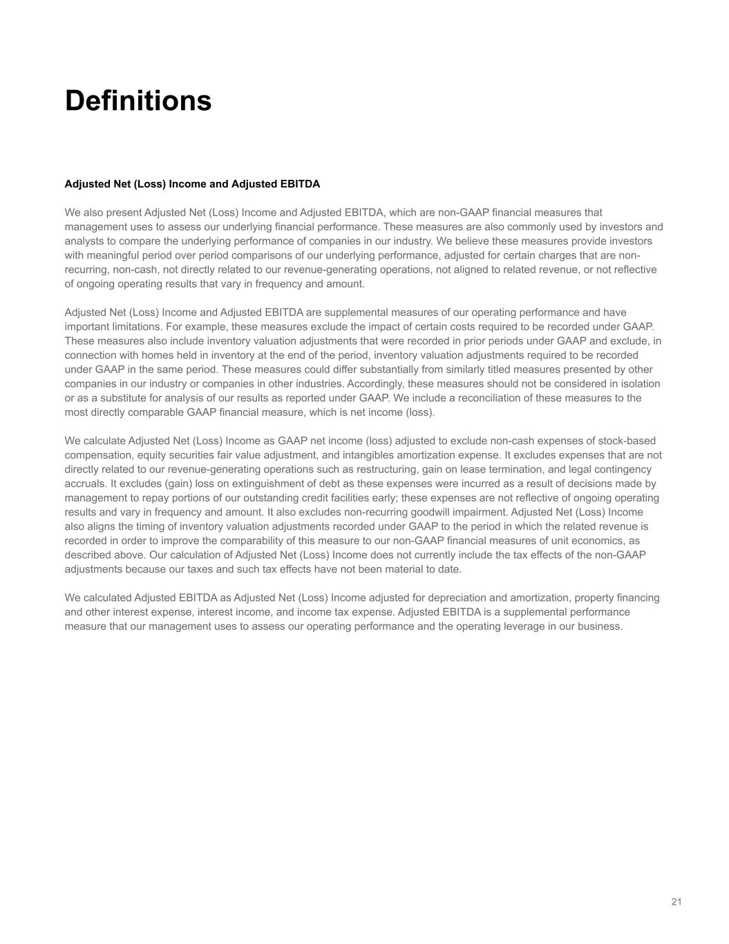21 Adjusted Net (Loss) Income and Adjusted EBITDA We also present Adjusted Net (Loss) Income and Adjusted EBITDA, which are non-GAAP financial measures that management uses to assess our underlying financial performance. These measures are also commonly used by investors and analysts to compare the underlying performance of companies in our industry. We believe these measures provide investors with meaningful period over period comparisons of our underlying performance, adjusted for certain charges that are non- recurring, non-cash, not directly related to our revenue-generating operations, not aligned to related revenue, or not reflective of ongoing operating results that vary in frequency and amount. Adjusted Net (Loss) Income and Adjusted EBITDA are supplemental measures of our operating performance and have important limitations. For example, these measures exclude the impact of certain costs required to be recorded under GAAP. These measures also include inventory valuation adjustments that were recorded in prior periods under GAAP and exclude, in connection with homes held in inventory at the end of the period, inventory valuation adjustments required to be recorded under GAAP in the same period. These measures could differ substantially from similarly titled measures presented by other companies in our industry or companies in other industries. Accordingly, these measures should not be considered in isolation or as a substitute for analysis of our results as reported under GAAP. We include a reconciliation of these measures to the most directly comparable GAAP financial measure, which is net income (loss). We calculate Adjusted Net (Loss) Income as GAAP net income (loss) adjusted to exclude non-cash expenses of stock-based compensation, equity securities fair value adjustment, and intangibles amortization expense. It excludes expenses that are not directly related to our revenue-generating operations such as restructuring, gain on lease termination, and legal contingency accruals. It excludes (gain) loss on extinguishment of debt as these expenses were incurred as a result of decisions made by management to repay portions of our outstanding credit facilities early; these expenses are not reflective of ongoing operating results and vary in frequency and amount. It also excludes non-recurring goodwill impairment. Adjusted Net (Loss) Income also aligns the timing of inventory valuation adjustments recorded under GAAP to the period in which the related revenue is recorded in order to improve the comparability of this measure to our non-GAAP financial measures of unit economics, as described above. Our calculation of Adjusted Net (Loss) Income does not currently include the tax effects of the non-GAAP adjustments because our taxes and such tax effects have not been material to date. We calculated Adjusted EBITDA as Adjusted Net (Loss) Income adjusted for depreciation and amortization, property financing and other interest expense, interest income, and income tax expense. Adjusted EBITDA is a supplemental performance measure that our management uses to assess our operating performance and the operating leverage in our business. Definitions