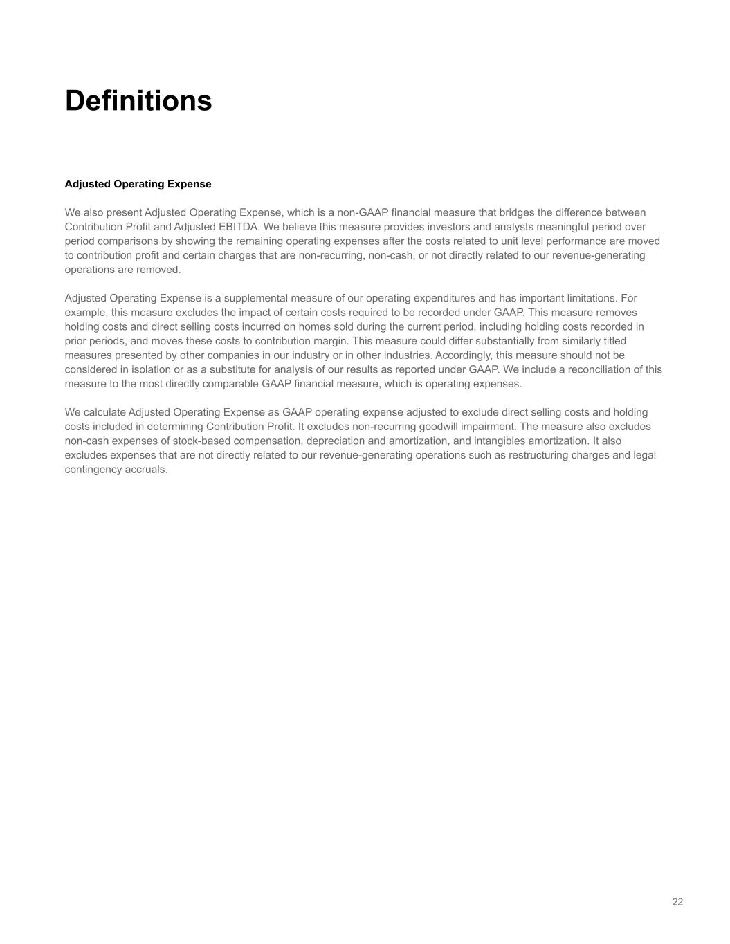 22 Adjusted Operating Expense We also present Adjusted Operating Expense, which is a non-GAAP financial measure that bridges the difference between Contribution Profit and Adjusted EBITDA. We believe this measure provides investors and analysts meaningful period over period comparisons by showing the remaining operating expenses after the costs related to unit level performance are moved to contribution profit and certain charges that are non-recurring, non-cash, or not directly related to our revenue-generating operations are removed. Adjusted Operating Expense is a supplemental measure of our operating expenditures and has important limitations. For example, this measure excludes the impact of certain costs required to be recorded under GAAP. This measure removes holding costs and direct selling costs incurred on homes sold during the current period, including holding costs recorded in prior periods, and moves these costs to contribution margin. This measure could differ substantially from similarly titled measures presented by other companies in our industry or in other industries. Accordingly, this measure should not be considered in isolation or as a substitute for analysis of our results as reported under GAAP. We include a reconciliation of this measure to the most directly comparable GAAP financial measure, which is operating expenses. We calculate Adjusted Operating Expense as GAAP operating expense adjusted to exclude direct selling costs and holding costs included in determining Contribution Profit. It excludes non-recurring goodwill impairment. The measure also excludes non-cash expenses of stock-based compensation, depreciation and amortization, and intangibles amortization. It also excludes expenses that are not directly related to our revenue-generating operations such as restructuring charges and legal contingency accruals. Definitions