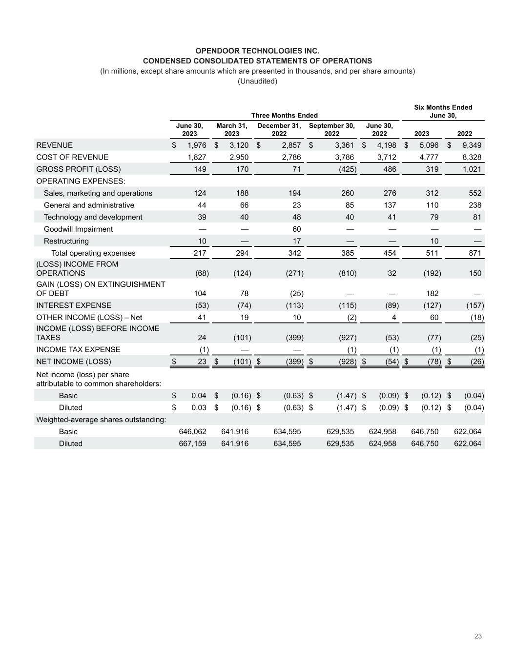 23 Three Months Ended Six Months Ended June 30, June 30, 2023 March 31, 2023 December 31, 2022 September 30, 2022 June 30, 2022 2023 2022 REVENUE $ 1,976 $ 3,120 $ 2,857 $ 3,361 $ 4,198 $ 5,096 $ 9,349 COST OF REVENUE 1,827 2,950 2,786 3,786 3,712 4,777 8,328 GROSS PROFIT (LOSS) 149 170 71 (425) 486 319 1,021 OPERATING EXPENSES: Sales, marketing and operations 124 188 194 260 276 312 552 General and administrative 44 66 23 85 137 110 238 Technology and development 39 40 48 40 41 79 81 Goodwill Impairment — — 60 — — — — Restructuring 10 — 17 — — 10 — Total operating expenses 217 294 342 385 454 511 871 (LOSS) INCOME FROM OPERATIONS (68) (124) (271) (810) 32 (192) 150 GAIN (LOSS) ON EXTINGUISHMENT OF DEBT 104 78 (25) — — 182 — INTEREST EXPENSE (53) (74) (113) (115) (89) (127) (157) OTHER INCOME (LOSS) – Net 41 19 10 (2) 4 60 (18) INCOME (LOSS) BEFORE INCOME TAXES 24 (101) (399) (927) (53) (77) (25) INCOME TAX EXPENSE (1) — — (1) (1) (1) (1) NET INCOME (LOSS) $ 23 $ (101) $ (399) $ (928) $ (54) $ (78) $ (26) Net income (loss) per share attributable to common shareholders: Basic $ 0.04 $ (0.16) $ (0.63) $ (1.47) $ (0.09) $ (0.12) $ (0.04) Diluted $ 0.03 $ (0.16) $ (0.63) $ (1.47) $ (0.09) $ (0.12) $ (0.04) Weighted-average shares outstanding: Basic 646,062 641,916 634,595 629,535 624,958 646,750 622,064 Diluted 667,159 641,916 634,595 629,535 624,958 646,750 622,064 OPENDOOR TECHNOLOGIES INC. CONDENSED CONSOLIDATED STATEMENTS OF OPERATIONS (In millions, except share amounts which are presented in thousands, and per share amounts) (Unaudited)