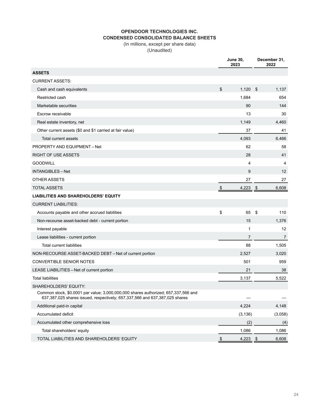 24 OPENDOOR TECHNOLOGIES INC. CONDENSED CONSOLIDATED BALANCE SHEETS (In millions, except per share data) (Unaudited) June 30, 2023 December 31, 2022 ASSETS CURRENT ASSETS: Cash and cash equivalents $ 1,120 $ 1,137 Restricted cash 1,684 654 Marketable securities 90 144 Escrow receivable 13 30 Real estate inventory, net 1,149 4,460 Other current assets ($0 and $1 carried at fair value) 37 41 Total current assets 4,093 6,466 PROPERTY AND EQUIPMENT – Net 62 58 RIGHT OF USE ASSETS 28 41 GOODWILL 4 4 INTANGIBLES – Net 9 12 OTHER ASSETS 27 27 TOTAL ASSETS $ 4,223 $ 6,608 LIABILITIES AND SHAREHOLDERS’ EQUITY CURRENT LIABILITIES: Accounts payable and other accrued liabilities $ 65 $ 110 Non-recourse asset-backed debt - current portion 15 1,376 Interest payable 1 12 Lease liabilities - current portion 7 7 Total current liabilities 88 1,505 NON-RECOURSE ASSET-BACKED DEBT – Net of current portion 2,527 3,020 CONVERTIBLE SENIOR NOTES 501 959 LEASE LIABILITIES – Net of current portion 21 38 Total liabilities 3,137 5,522 SHAREHOLDERS’ EQUITY: Common stock, $0.0001 par value; 3,000,000,000 shares authorized; 657,337,566 and 637,387,025 shares issued, respectively; 657,337,566 and 637,387,025 shares — — Additional paid-in capital 4,224 4,148 Accumulated deficit (3,136) (3,058) Accumulated other comprehensive loss (2) (4) Total shareholders’ equity 1,086 1,086 TOTAL LIABILITIES AND SHAREHOLDERS’ EQUITY $ 4,223 $ 6,608