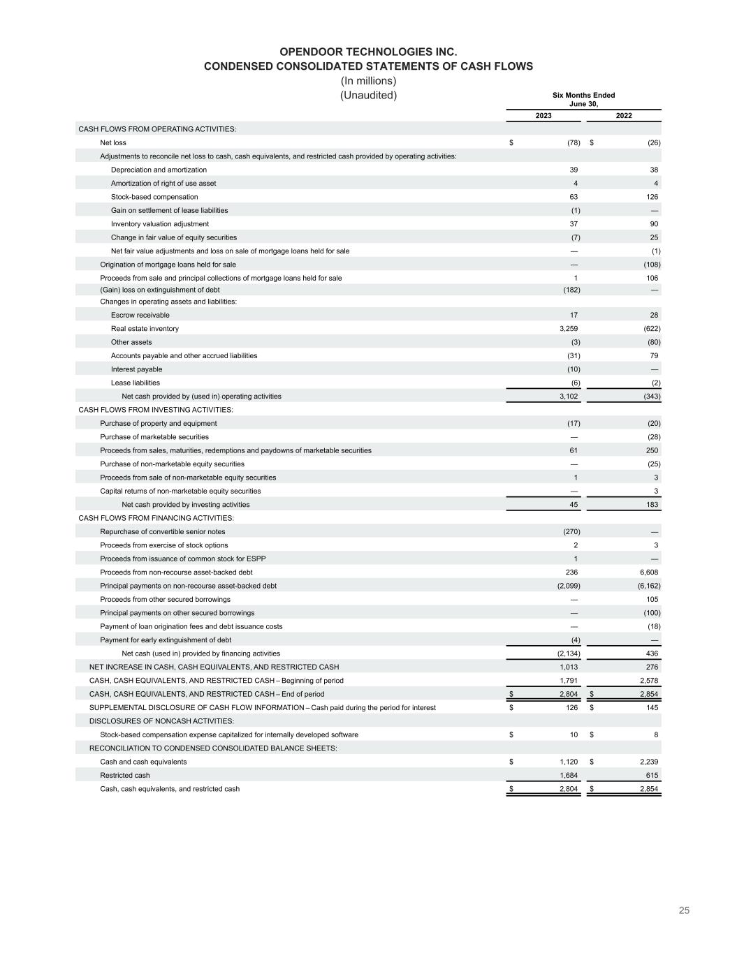 25 OPENDOOR TECHNOLOGIES INC. CONDENSED CONSOLIDATED STATEMENTS OF CASH FLOWS (In millions) (Unaudited) Six Months Ended June 30, 2023 2022 CASH FLOWS FROM OPERATING ACTIVITIES: Net loss $ (78) $ (26) Adjustments to reconcile net loss to cash, cash equivalents, and restricted cash provided by operating activities: Depreciation and amortization  39 38 Amortization of right of use asset 4 4 Stock-based compensation 63 126 Gain on settlement of lease liabilities (1) — Inventory valuation adjustment 37 90 Change in fair value of equity securities (7) 25 Net fair value adjustments and loss on sale of mortgage loans held for sale — (1) Origination of mortgage loans held for sale — (108) Proceeds from sale and principal collections of mortgage loans held for sale 1 106 (Gain) loss on extinguishment of debt (182) — Changes in operating assets and liabilities: Escrow receivable 17 28 Real estate inventory 3,259 (622) Other assets (3) (80) Accounts payable and other accrued liabilities (31) 79 Interest payable (10) — Lease liabilities (6) (2) Net cash provided by (used in) operating activities 3,102 (343) CASH FLOWS FROM INVESTING ACTIVITIES: Purchase of property and equipment (17) (20) Purchase of marketable securities — (28) Proceeds from sales, maturities, redemptions and paydowns of marketable securities 61 250 Purchase of non-marketable equity securities — (25) Proceeds from sale of non-marketable equity securities 1 3 Capital returns of non-marketable equity securities — 3 Net cash provided by investing activities 45 183 CASH FLOWS FROM FINANCING ACTIVITIES: Repurchase of convertible senior notes (270) — Proceeds from exercise of stock options 2 3 Proceeds from issuance of common stock for ESPP 1 — Proceeds from non-recourse asset-backed debt 236 6,608 Principal payments on non-recourse asset-backed debt (2,099) (6,162) Proceeds from other secured borrowings — 105 Principal payments on other secured borrowings — (100) Payment of loan origination fees and debt issuance costs — (18) Payment for early extinguishment of debt (4) — Net cash (used in) provided by financing activities (2,134) 436 NET INCREASE IN CASH, CASH EQUIVALENTS, AND RESTRICTED CASH 1,013 276 CASH, CASH EQUIVALENTS, AND RESTRICTED CASH – Beginning of period 1,791 2,578 CASH, CASH EQUIVALENTS, AND RESTRICTED CASH – End of period $ 2,804 $ 2,854 SUPPLEMENTAL DISCLOSURE OF CASH FLOW INFORMATION – Cash paid during the period for interest $ 126 $ 145 DISCLOSURES OF NONCASH ACTIVITIES: Stock-based compensation expense capitalized for internally developed software $ 10 $ 8 RECONCILIATION TO CONDENSED CONSOLIDATED BALANCE SHEETS: Cash and cash equivalents $ 1,120 $ 2,239 Restricted cash 1,684 615 Cash, cash equivalents, and restricted cash $ 2,804 $ 2,854
