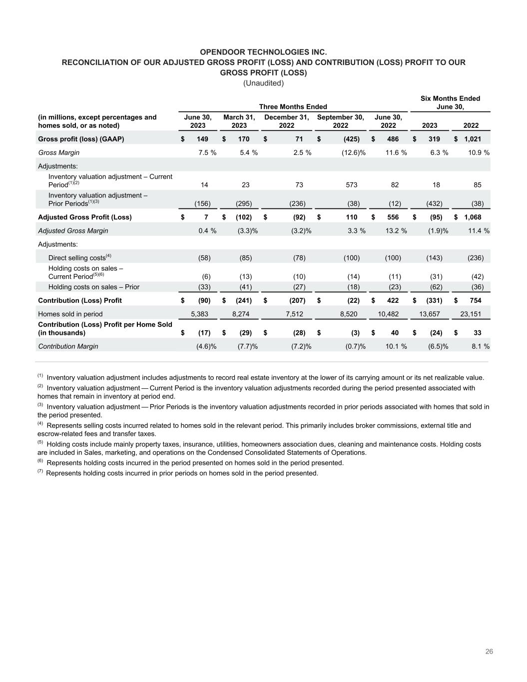 26 OPENDOOR TECHNOLOGIES INC. RECONCILIATION OF OUR ADJUSTED GROSS PROFIT (LOSS) AND CONTRIBUTION (LOSS) PROFIT TO OUR GROSS PROFIT (LOSS) (Unaudited) Three Months Ended Six Months Ended June 30, (in millions, except percentages and homes sold, or as noted) June 30, 2023 March 31, 2023 December 31, 2022 September 30, 2022 June 30, 2022 2023 2022 Gross profit (loss) (GAAP) $ 149 $ 170 $ 71 $ (425) $ 486 $ 319 $ 1,021 Gross Margin 7.5 % 5.4 % 2.5 % (12.6) % 11.6 % 6.3 % 10.9 % Adjustments: Inventory valuation adjustment – Current Period͏(1)(2) 14 23 73 573 82 18 85 Inventory valuation adjustment – Prior Periods͏(1)(3) (156) (295) (236) (38) (12) (432) (38) Adjusted Gross Profit (Loss) $ 7 $ (102) $ (92) $ 110 $ 556 $ (95) $ 1,068 Adjusted Gross Margin 0.4 % (3.3) % (3.2) % 3.3 % 13.2 % (1.9) % 11.4 % Adjustments: Direct selling costs(4) (58) (85) (78) (100) (100) (143) (236) Holding costs on sales – Current Period͏(5)(6) (6) (13) (10) (14) (11) (31) (42) Holding costs on sales – Prior (33) (41) (27) (18) (23) (62) (36) Contribution (Loss) Profit $ (90) $ (241) $ (207) $ (22) $ 422 $ (331) $ 754 Homes sold in period 5,383 8,274 7,512 8,520 10,482 13,657 23,151 Contribution (Loss) Profit per Home Sold (in thousands) $ (17) $ (29) $ (28) $ (3) $ 40 $ (24) $ 33 Contribution Margin (4.6) % (7.7) % (7.2) % (0.7) % 10.1 % (6.5) % 8.1 % (1) Inventory valuation adjustment includes adjustments to record real estate inventory at the lower of its carrying amount or its net realizable value. (2) Inventory valuation adjustment — Current Period is the inventory valuation adjustments recorded during the period presented associated with homes that remain in inventory at period end. (3) Inventory valuation adjustment — Prior Periods is the inventory valuation adjustments recorded in prior periods associated with homes that sold in the period presented. (4) Represents selling costs incurred related to homes sold in the relevant period. This primarily includes broker commissions, external title and escrow-related fees and transfer taxes. (5) Holding costs include mainly property taxes, insurance, utilities, homeowners association dues, cleaning and maintenance costs. Holding costs are included in Sales, marketing, and operations on the Condensed Consolidated Statements of Operations. (6) Represents holding costs incurred in the period presented on homes sold in the period presented. (7) Represents holding costs incurred in prior periods on homes sold in the period presented.