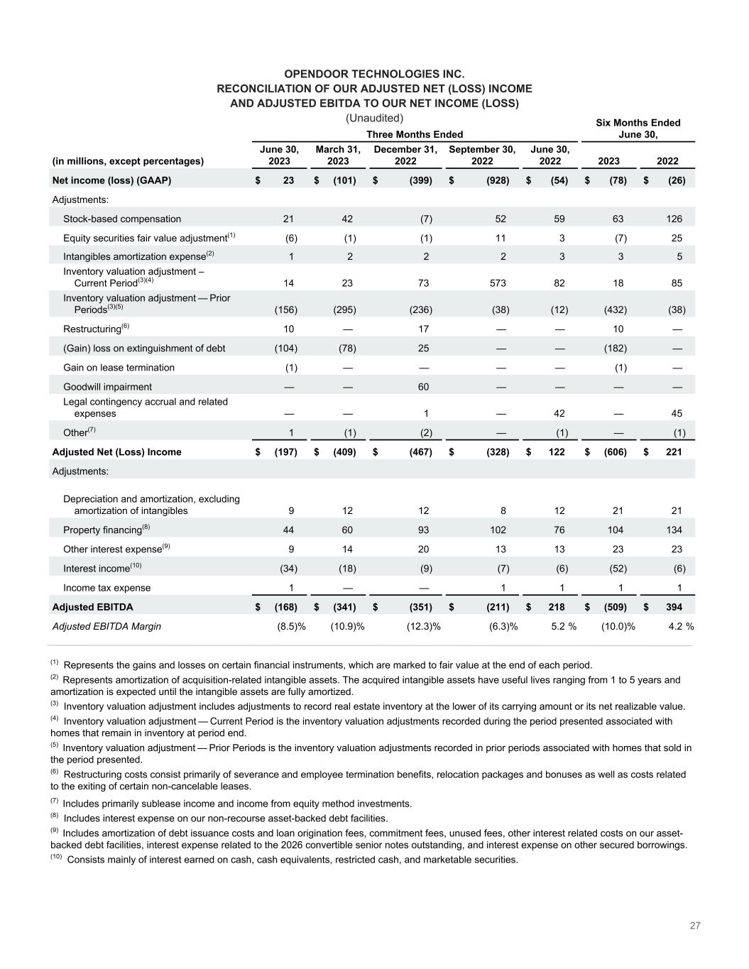 27 OPENDOOR TECHNOLOGIES INC. RECONCILIATION OF OUR ADJUSTED NET (LOSS) INCOME AND ADJUSTED EBITDA TO OUR NET INCOME (LOSS) (Unaudited) Three Months Ended Six Months Ended June 30, (in millions, except percentages) June 30, 2023 March 31, 2023 December 31, 2022 September 30, 2022 June 30, 2022 2023 2022 Net income (loss) (GAAP) $ 23 $ (101) $ (399) $ (928) $ (54) $ (78) $ (26) Adjustments: Stock-based compensation 21 42 (7) 52 59 63 126 Equity securities fair value adjustment(1) (6) (1) (1) 11 3 (7) 25 Intangibles amortization expense(2) 1 2 2 2 3 3 5 Inventory valuation adjustment – Current Period͏(3)(4) 14 23 73 573 82 18 85 Inventory valuation adjustment — Prior Periods͏(3)(5) (156) (295) (236) (38) (12) (432) (38) Restructuring(6) 10 — 17 — — 10 — (Gain) loss on extinguishment of debt (104) (78) 25 — — (182) — Gain on lease termination (1) — — — — (1) — Goodwill impairment — — 60 — — — — Legal contingency accrual and related expenses — — 1 — 42 — 45 Other(7) 1 (1) (2) — (1) — (1) Adjusted Net (Loss) Income $ (197) $ (409) $ (467) $ (328) $ 122 $ (606) $ 221 Adjustments: Depreciation and amortization, excluding amortization of intangibles 9 12 12 8 12 21 21 Property financing(8) 44 60 93 102 76 104 134 Other interest expense(9) 9 14 20 13 13 23 23 Interest income(10) (34) (18) (9) (7) (6) (52) (6) Income tax expense 1 — — 1 1 1 1 Adjusted EBITDA $ (168) $ (341) $ (351) $ (211) $ 218 $ (509) $ 394 Adjusted EBITDA Margin (8.5) % (10.9) % (12.3) % (6.3) % 5.2 % (10.0) % 4.2 % (1) Represents the gains and losses on certain financial instruments, which are marked to fair value at the end of each period. (2) Represents amortization of acquisition-related intangible assets. The acquired intangible assets have useful lives ranging from 1 to 5 years and amortization is expected until the intangible assets are fully amortized. (3) Inventory valuation adjustment includes adjustments to record real estate inventory at the lower of its carrying amount or its net realizable value. (4) Inventory valuation adjustment — Current Period is the inventory valuation adjustments recorded during the period presented associated with homes that remain in inventory at period end. (5) Inventory valuation adjustment — Prior Periods is the inventory valuation adjustments recorded in prior periods associated with homes that sold in the period presented. (6) Restructuring costs consist primarily of severance and employee termination benefits, relocation packages and bonuses as well as costs related to the exiting of certain non-cancelable leases. (7) Includes primarily sublease income and income from equity method investments. (8) Includes interest expense on our non-recourse asset-backed debt facilities. (9) Includes amortization of debt issuance costs and loan origination fees, commitment fees, unused fees, other interest related costs on our asset- backed debt facilities, interest expense related to the 2026 convertible senior notes outstanding, and interest expense on other secured borrowings. (10) Consists mainly of interest earned on cash, cash equivalents, restricted cash, and marketable securities.