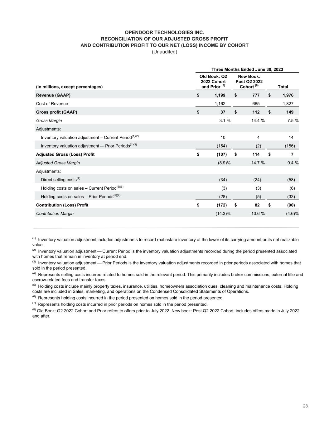28 OPENDOOR TECHNOLOGIES INC. RECONCILIATION OF OUR ADJUSTED GROSS PROFIT AND CONTRIBUTION PROFIT TO OUR NET (LOSS) INCOME BY COHORT (Unaudited) Three Months Ended June 30, 2023 (in millions, except percentages) Old Book: Q2 2022 Cohort and Prior (8) New Book: Post Q2 2022 Cohort (8) Total Revenue (GAAP) $ 1,199 $ 777 $ 1,976 Cost of Revenue 1,162 665 1,827 Gross profit (GAAP) $ 37 $ 112 $ 149 Gross Margin 3.1 % 14.4 % 7.5 % Adjustments: Inventory valuation adjustment – Current Period͏(1)(2) 10 4 14 Inventory valuation adjustment — Prior Periods͏(1)(3) (154) (2) (156) Adjusted Gross (Loss) Profit $ (107) $ 114 $ 7 Adjusted Gross Margin (8.9) % 14.7 % 0.4 % Adjustments: Direct selling costs(4) (34) (24) (58) Holding costs on sales – Current Period͏(5)(6) (3) (3) (6) Holding costs on sales – Prior Periods͏(5)(7) (28) (5) (33) Contribution (Loss) Profit $ (172) $ 82 $ (90) Contribution Margin (14.3) % 10.6 % (4.6) % (1) Inventory valuation adjustment includes adjustments to record real estate inventory at the lower of its carrying amount or its net realizable value. (2) Inventory valuation adjustment — Current Period is the inventory valuation adjustments recorded during the period presented associated with homes that remain in inventory at period end. (3) Inventory valuation adjustment — Prior Periods is the inventory valuation adjustments recorded in prior periods associated with homes that sold in the period presented. (4) Represents selling costs incurred related to homes sold in the relevant period. This primarily includes broker commissions, external title and escrow-related fees and transfer taxes. (5) Holding costs include mainly property taxes, insurance, utilities, homeowners association dues, cleaning and maintenance costs. Holding costs are included in Sales, marketing, and operations on the Condensed Consolidated Statements of Operations. (6) Represents holding costs incurred in the period presented on homes sold in the period presented. (7) Represents holding costs incurred in prior periods on homes sold in the period presented. (8) Old Book: Q2 2022 Cohort and Prior refers to offers prior to July 2022. New book: Post Q2 2022 Cohort includes offers made in July 2022 and after.