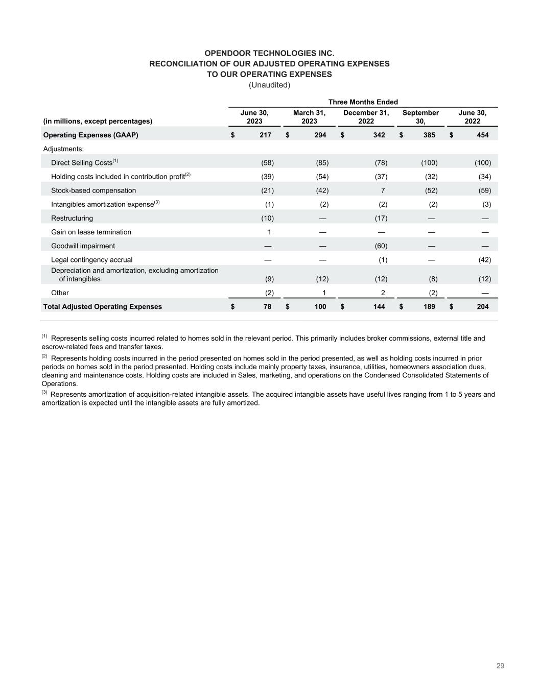 29 OPENDOOR TECHNOLOGIES INC. RECONCILIATION OF OUR ADJUSTED OPERATING EXPENSES TO OUR OPERATING EXPENSES (Unaudited) Three Months Ended (in millions, except percentages) June 30, 2023 March 31, 2023 December 31, 2022 September 30, June 30, 2022 Operating Expenses (GAAP) $ 217 $ 294 $ 342 $ 385 $ 454 Adjustments: Direct Selling Costs(1) (58) (85) (78) (100) (100) Holding costs included in contribution profit(2) (39) (54) (37) (32) (34) Stock-based compensation (21) (42) 7 (52) (59) Intangibles amortization expense(3) (1) (2) (2) (2) (3) Restructuring (10) — (17) — — Gain on lease termination 1 — — — — Goodwill impairment — — (60) — — Legal contingency accrual — — (1) — (42) Depreciation and amortization, excluding amortization of intangibles (9) (12) (12) (8) (12) Other (2) 1 2 (2) — Total Adjusted Operating Expenses $ 78 $ 100 $ 144 $ 189 $ 204 (1) Represents selling costs incurred related to homes sold in the relevant period. This primarily includes broker commissions, external title and escrow-related fees and transfer taxes. (2) Represents holding costs incurred in the period presented on homes sold in the period presented, as well as holding costs incurred in prior periods on homes sold in the period presented. Holding costs include mainly property taxes, insurance, utilities, homeowners association dues, cleaning and maintenance costs. Holding costs are included in Sales, marketing, and operations on the Condensed Consolidated Statements of Operations. (3) Represents amortization of acquisition-related intangible assets. The acquired intangible assets have useful lives ranging from 1 to 5 years and amortization is expected until the intangible assets are fully amortized.