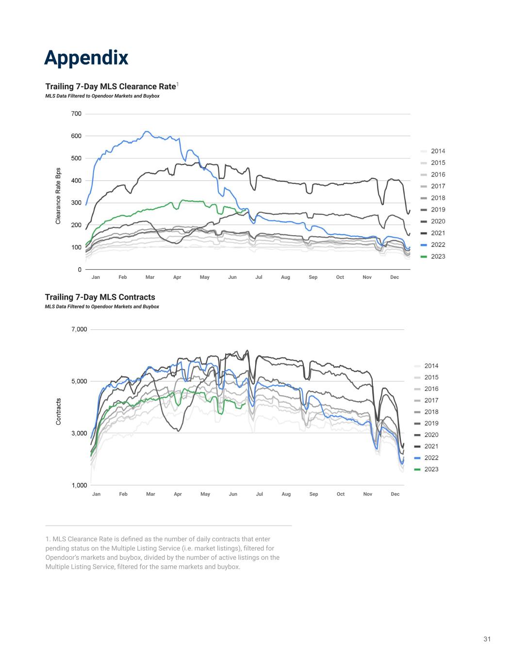 Appendix 1. MLS Clearance Rate is defined as the number of daily contracts that enter pending status on the Multiple Listing Service (i.e. market listings), filtered for Opendoor’s markets and buybox, divided by the number of active listings on the Multiple Listing Service, filtered for the same markets and buybox. Trailing 7-Day MLS Clearance Rate1 MLS Data Filtered to Opendoor Markets and Buybox Trailing 7-Day MLS Contracts MLS Data Filtered to Opendoor Markets and Buybox Jan Feb Mar Apr May Jun Jul Aug Sep Oct Nov Dec Jan Feb Mar Apr May Jun Jul Aug Sep Oct Nov Dec 31