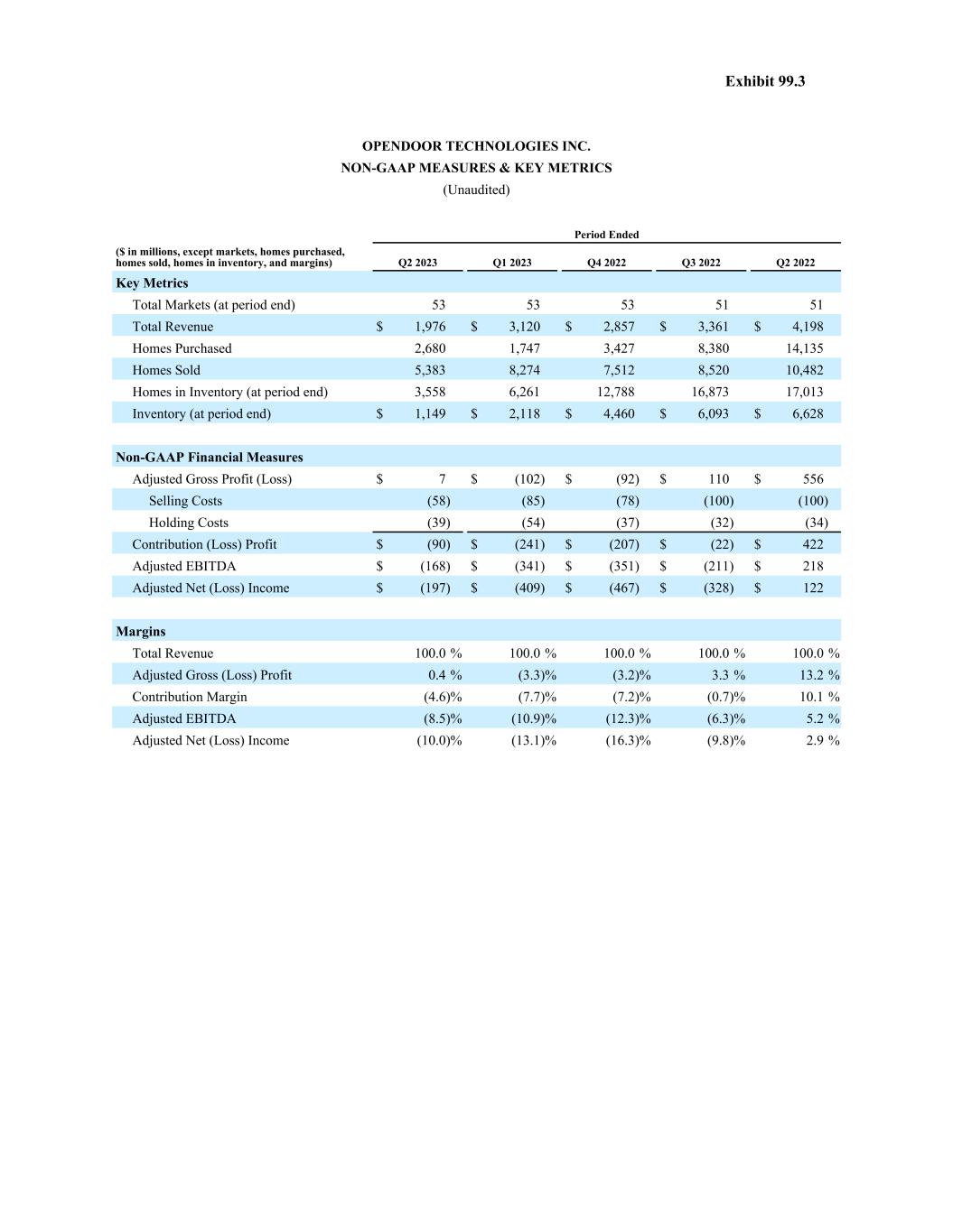 OPENDOOR TECHNOLOGIES INC. NON-GAAP MEASURES & KEY METRICS (Unaudited) Period Ended ($ in millions, except markets, homes purchased, homes sold, homes in inventory, and margins) Q2 2023 Q1 2023 Q4 2022 Q3 2022 Q2 2022 Key Metrics Total Markets (at period end) 53 53 53 51 51 Total Revenue $ 1,976 $ 3,120 $ 2,857 $ 3,361 $ 4,198 Homes Purchased 2,680 1,747 3,427 8,380 14,135 Homes Sold 5,383 8,274 7,512 8,520 10,482 Homes in Inventory (at period end) 3,558 6,261 12,788 16,873 17,013 Inventory (at period end) $ 1,149 $ 2,118 $ 4,460 $ 6,093 $ 6,628 Non-GAAP Financial Measures Adjusted Gross Profit (Loss) $ 7 $ (102) $ (92) $ 110 $ 556 Selling Costs (58) (85) (78) (100) (100) Holding Costs (39) (54) (37) (32) (34) Contribution (Loss) Profit $ (90) $ (241) $ (207) $ (22) $ 422 Adjusted EBITDA $ (168) $ (341) $ (351) $ (211) $ 218 Adjusted Net (Loss) Income $ (197) $ (409) $ (467) $ (328) $ 122 Margins Total Revenue 100.0 % 100.0 % 100.0 % 100.0 % 100.0 % Adjusted Gross (Loss) Profit 0.4 % (3.3) % (3.2) % 3.3 % 13.2 % Contribution Margin (4.6) % (7.7) % (7.2) % (0.7) % 10.1 % Adjusted EBITDA (8.5) % (10.9) % (12.3) % (6.3) % 5.2 % Adjusted Net (Loss) Income (10.0) % (13.1) % (16.3) % (9.8) % 2.9 % Exhibit 99.3