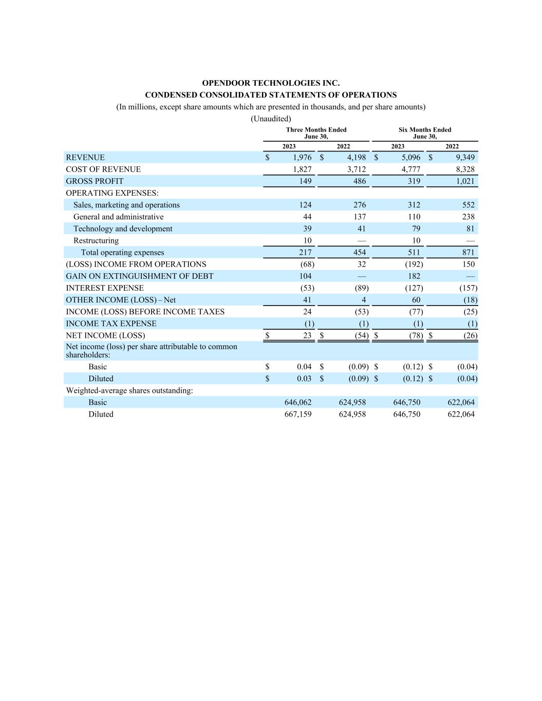 OPENDOOR TECHNOLOGIES INC. CONDENSED CONSOLIDATED STATEMENTS OF OPERATIONS (In millions, except share amounts which are presented in thousands, and per share amounts) (Unaudited) Three Months Ended June 30, Six Months Ended June 30, 2023 2022 2023 2022 REVENUE $ 1,976 $ 4,198 $ 5,096 $ 9,349 COST OF REVENUE 1,827 3,712 4,777 8,328 GROSS PROFIT 149 486 319 1,021 OPERATING EXPENSES: Sales, marketing and operations 124 276 312 552 General and administrative 44 137 110 238 Technology and development 39 41 79 81 Restructuring 10 — 10 — Total operating expenses 217 454 511 871 (LOSS) INCOME FROM OPERATIONS (68) 32 (192) 150 GAIN ON EXTINGUISHMENT OF DEBT 104 — 182 — INTEREST EXPENSE (53) (89) (127) (157) OTHER INCOME (LOSS) – Net 41 4 60 (18) INCOME (LOSS) BEFORE INCOME TAXES 24 (53) (77) (25) INCOME TAX EXPENSE (1) (1) (1) (1) NET INCOME (LOSS) $ 23 $ (54) $ (78) $ (26) Net income (loss) per share attributable to common shareholders: Basic $ 0.04 $ (0.09) $ (0.12) $ (0.04) Diluted $ 0.03 $ (0.09) $ (0.12) $ (0.04) Weighted-average shares outstanding: Basic 646,062 624,958 646,750 622,064 Diluted 667,159 624,958 646,750 622,064