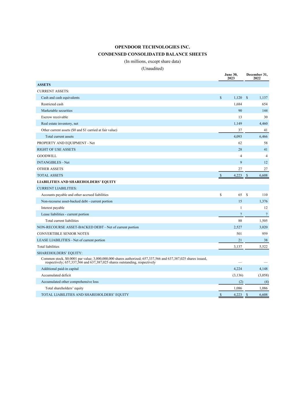 OPENDOOR TECHNOLOGIES INC. CONDENSED CONSOLIDATED BALANCE SHEETS (In millions, except share data) (Unaudited) June 30, 2023 December 31, 2022 ASSETS CURRENT ASSETS: Cash and cash equivalents $ 1,120 $ 1,137 Restricted cash 1,684 654 Marketable securities 90 144 Escrow receivable 13 30 Real estate inventory, net 1,149 4,460 Other current assets ($0 and $1 carried at fair value) 37 41 Total current assets 4,093 6,466 PROPERTY AND EQUIPMENT – Net 62 58 RIGHT OF USE ASSETS 28 41 GOODWILL 4 4 INTANGIBLES – Net 9 12 OTHER ASSETS 27 27 TOTAL ASSETS $ 4,223 $ 6,608 LIABILITIES AND SHAREHOLDERS’ EQUITY CURRENT LIABILITIES: Accounts payable and other accrued liabilities $ 65 $ 110 Non-recourse asset-backed debt - current portion 15 1,376 Interest payable 1 12 Lease liabilities - current portion 7 7 Total current liabilities 88 1,505 NON-RECOURSE ASSET-BACKED DEBT – Net of current portion 2,527 3,020 CONVERTIBLE SENIOR NOTES 501 959 LEASE LIABILITIES – Net of current portion 21 38 Total liabilities 3,137 5,522 SHAREHOLDERS’ EQUITY: Common stock, $0.0001 par value; 3,000,000,000 shares authorized; 657,337,566 and 637,387,025 shares issued, respectively; 657,337,566 and 637,387,025 shares outstanding, respectively — — Additional paid-in capital 4,224 4,148 Accumulated deficit (3,136) (3,058) Accumulated other comprehensive loss (2) (4) Total shareholders’ equity 1,086 1,086 TOTAL LIABILITIES AND SHAREHOLDERS’ EQUITY $ 4,223 $ 6,608