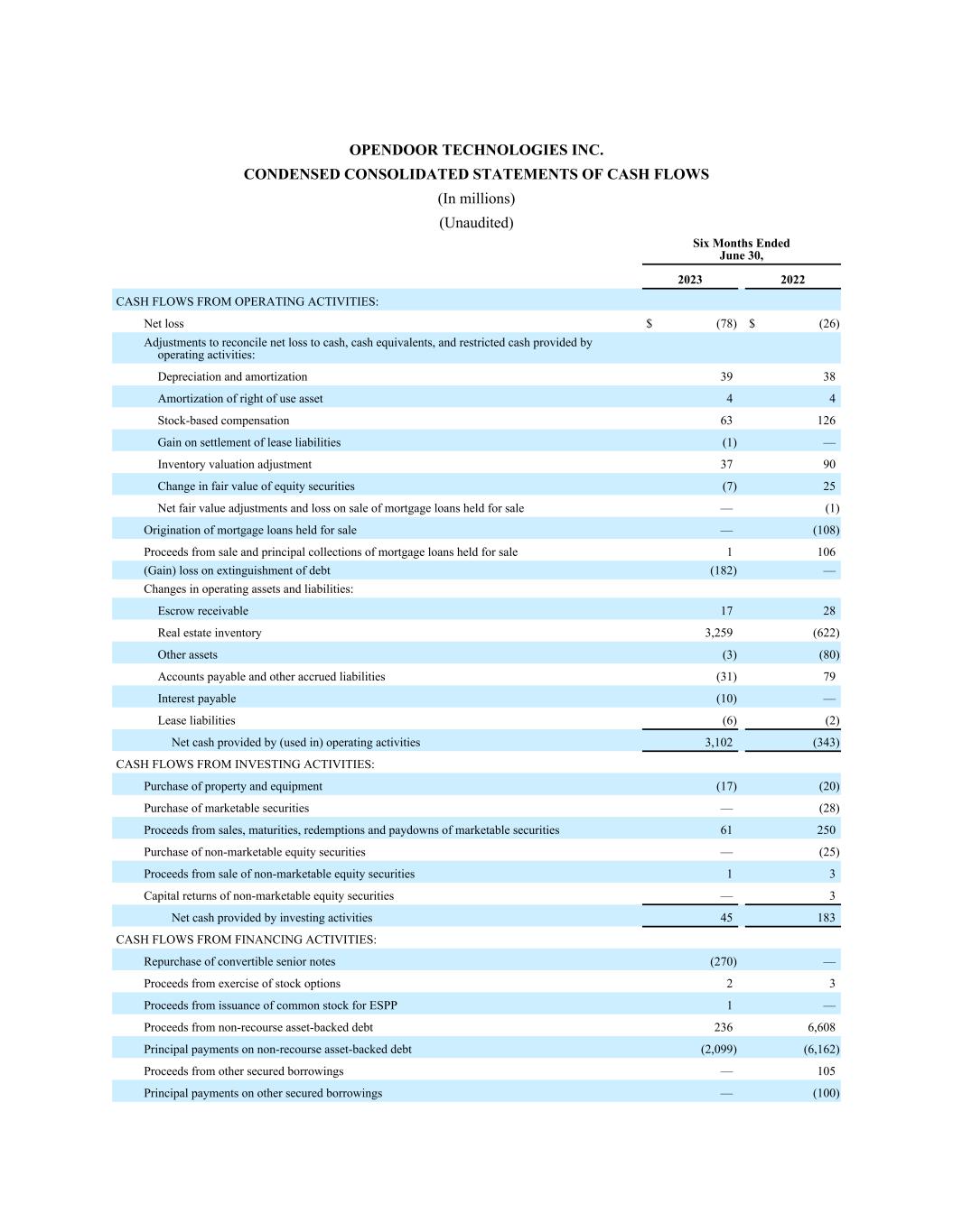 OPENDOOR TECHNOLOGIES INC. CONDENSED CONSOLIDATED STATEMENTS OF CASH FLOWS (In millions) (Unaudited) Six Months Ended June 30, 2023 2022 CASH FLOWS FROM OPERATING ACTIVITIES: Net loss $ (78) $ (26) Adjustments to reconcile net loss to cash, cash equivalents, and restricted cash provided by operating activities: Depreciation and amortization  39 38 Amortization of right of use asset 4 4 Stock-based compensation 63 126 Gain on settlement of lease liabilities (1) — Inventory valuation adjustment 37 90 Change in fair value of equity securities (7) 25 Net fair value adjustments and loss on sale of mortgage loans held for sale — (1) Origination of mortgage loans held for sale — (108) Proceeds from sale and principal collections of mortgage loans held for sale 1 106 (Gain) loss on extinguishment of debt (182) — Changes in operating assets and liabilities: Escrow receivable 17 28 Real estate inventory 3,259 (622) Other assets (3) (80) Accounts payable and other accrued liabilities (31) 79 Interest payable (10) — Lease liabilities (6) (2) Net cash provided by (used in) operating activities 3,102 (343) CASH FLOWS FROM INVESTING ACTIVITIES: Purchase of property and equipment (17) (20) Purchase of marketable securities — (28) Proceeds from sales, maturities, redemptions and paydowns of marketable securities 61 250 Purchase of non-marketable equity securities — (25) Proceeds from sale of non-marketable equity securities 1 3 Capital returns of non-marketable equity securities — 3 Net cash provided by investing activities 45 183 CASH FLOWS FROM FINANCING ACTIVITIES: Repurchase of convertible senior notes (270) — Proceeds from exercise of stock options 2 3 Proceeds from issuance of common stock for ESPP 1 — Proceeds from non-recourse asset-backed debt 236 6,608 Principal payments on non-recourse asset-backed debt (2,099) (6,162) Proceeds from other secured borrowings — 105 Principal payments on other secured borrowings — (100)