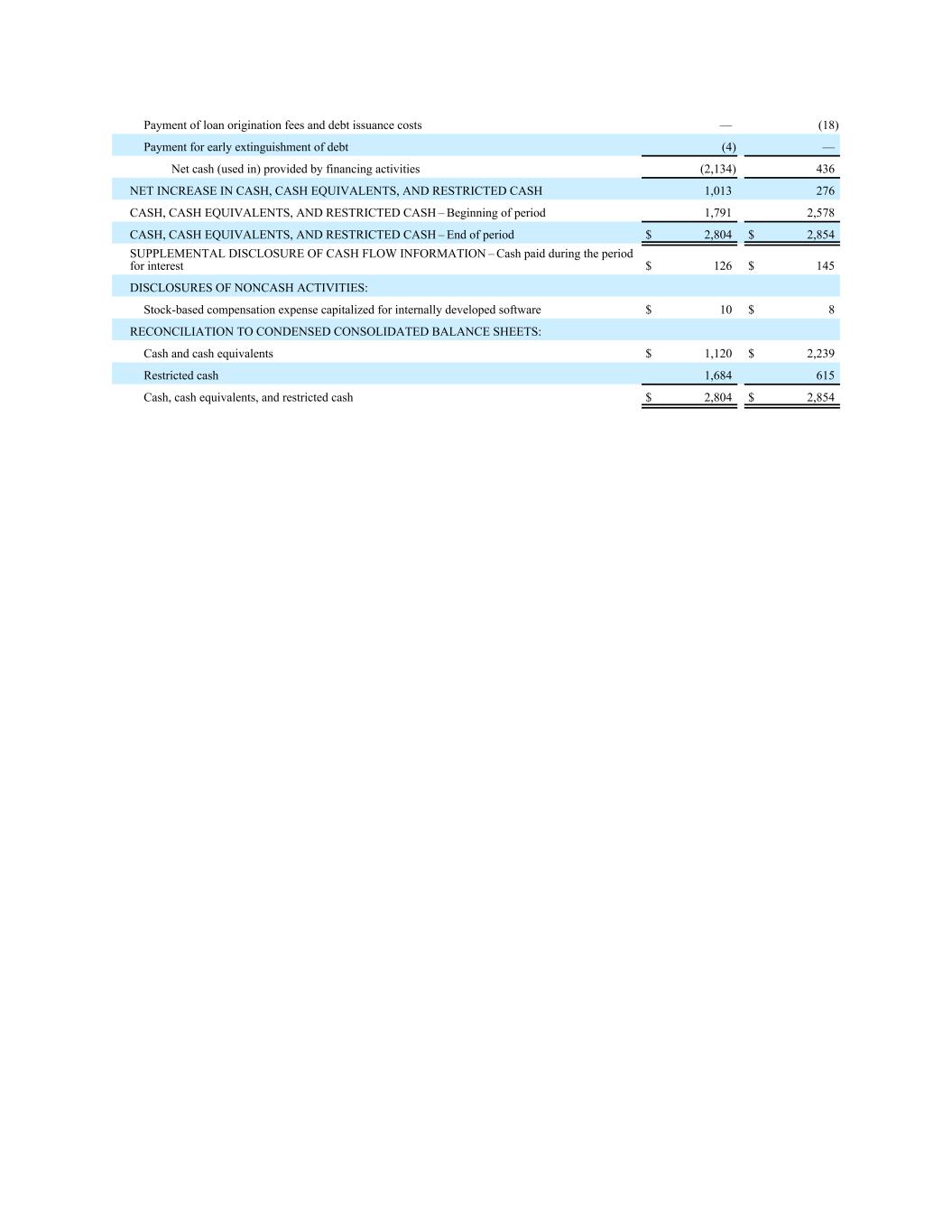 Payment of loan origination fees and debt issuance costs — (18) Payment for early extinguishment of debt (4) — Net cash (used in) provided by financing activities (2,134) 436 NET INCREASE IN CASH, CASH EQUIVALENTS, AND RESTRICTED CASH 1,013 276 CASH, CASH EQUIVALENTS, AND RESTRICTED CASH – Beginning of period 1,791 2,578 CASH, CASH EQUIVALENTS, AND RESTRICTED CASH – End of period $ 2,804 $ 2,854 SUPPLEMENTAL DISCLOSURE OF CASH FLOW INFORMATION – Cash paid during the period for interest $ 126 $ 145 DISCLOSURES OF NONCASH ACTIVITIES: Stock-based compensation expense capitalized for internally developed software $ 10 $ 8 RECONCILIATION TO CONDENSED CONSOLIDATED BALANCE SHEETS: Cash and cash equivalents $ 1,120 $ 2,239 Restricted cash 1,684 615 Cash, cash equivalents, and restricted cash $ 2,804 $ 2,854