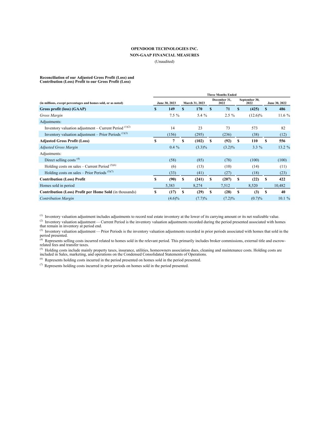 OPENDOOR TECHNOLOGIES INC. NON-GAAP FINANCIAL MEASURES (Unaudited) Reconciliation of our Adjusted Gross Profit (Loss) and Contribution (Loss) Profit to our Gross Profit (Loss) Three Months Ended (in millions, except percentages and homes sold, or as noted) June 30, 2023 March 31, 2023 December 31, 2022 September 30, 2022 June 30, 2022 Gross profit (loss) (GAAP) $ 149 $ 170 $ 71 $ (425) $ 486 Gross Margin 7.5 % 5.4 % 2.5 % (12.6) % 11.6 % Adjustments: Inventory valuation adjustment – Current Period͏ (1)(2) 14 23 73 573 82 Inventory valuation adjustment – Prior Periods͏ (1)(3) (156) (295) (236) (38) (12) Adjusted Gross Profit (Loss) $ 7 $ (102) $ (92) $ 110 $ 556 Adjusted Gross Margin 0.4 % (3.3) % (3.2) % 3.3 % 13.2 % Adjustments: Direct selling costs (4) (58) (85) (78) (100) (100) Holding costs on sales – Current Period͏ (5)(6) (6) (13) (10) (14) (11) Holding costs on sales – Prior Periods͏ (5)(7) (33) (41) (27) (18) (23) Contribution (Loss) Profit $ (90) $ (241) $ (207) $ (22) $ 422 Homes sold in period 5,383 8,274 7,512 8,520 10,482 Contribution (Loss) Profit per Home Sold (in thousands) $ (17) $ (29) $ (28) $ (3) $ 40 Contribution Margin (4.6) % (7.7) % (7.2) % (0.7) % 10.1 % (1) Inventory valuation adjustment includes adjustments to record real estate inventory at the lower of its carrying amount or its net realizable value. (2) Inventory valuation adjustment — Current Period is the inventory valuation adjustments recorded during the period presented associated with homes that remain in inventory at period end. (3) Inventory valuation adjustment — Prior Periods is the inventory valuation adjustments recorded in prior periods associated with homes that sold in the period presented. (4) Represents selling costs incurred related to homes sold in the relevant period. This primarily includes broker commissions, external title and escrow- related fees and transfer taxes. (5) Holding costs include mainly property taxes, insurance, utilities, homeowners association dues, cleaning and maintenance costs. Holding costs are included in Sales, marketing, and operations on the Condensed Consolidated Statements of Operations. (6) Represents holding costs incurred in the period presented on homes sold in the period presented. (7) Represents holding costs incurred in prior periods on homes sold in the period presented.