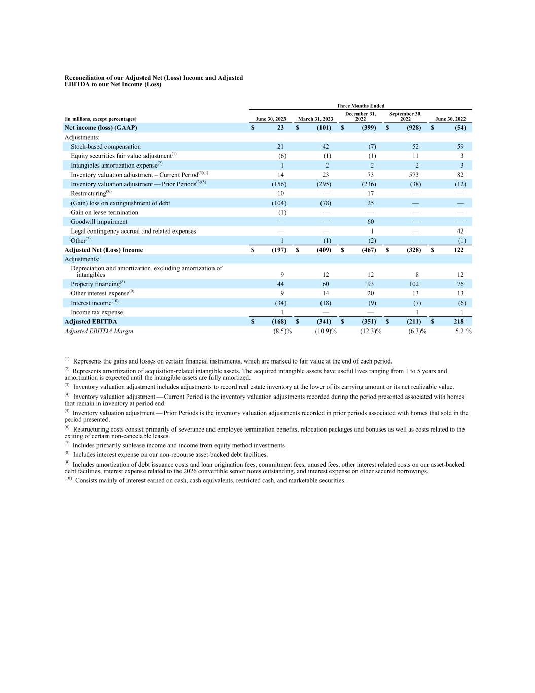 Reconciliation of our Adjusted Net (Loss) Income and Adjusted EBITDA to our Net Income (Loss) Three Months Ended (in millions, except percentages) June 30, 2023 March 31, 2023 December 31, 2022 September 30, 2022 June 30, 2022 Net income (loss) (GAAP) $ 23 $ (101) $ (399) $ (928) $ (54) Adjustments: Stock-based compensation 21 42 (7) 52 59 Equity securities fair value adjustment(1) (6) (1) (1) 11 3 Intangibles amortization expense(2) 1 2 2 2 3 Inventory valuation adjustment – Current Period͏(3)(4) 14 23 73 573 82 Inventory valuation adjustment — Prior Periods͏(3)(5) (156) (295) (236) (38) (12) Restructuring(6) 10 — 17 — — (Gain) loss on extinguishment of debt (104) (78) 25 — — Gain on lease termination (1) — — — — Goodwill impairment — — 60 — — Legal contingency accrual and related expenses — — 1 — 42 Other(7) 1 (1) (2) — (1) Adjusted Net (Loss) Income $ (197) $ (409) $ (467) $ (328) $ 122 Adjustments: Depreciation and amortization, excluding amortization of intangibles 9 12 12 8 12 Property financing(8) 44 60 93 102 76 Other interest expense(9) 9 14 20 13 13 Interest income(10) (34) (18) (9) (7) (6) Income tax expense 1 — — 1 1 Adjusted EBITDA $ (168) $ (341) $ (351) $ (211) $ 218 Adjusted EBITDA Margin (8.5) % (10.9) % (12.3) % (6.3) % 5.2 % (1) Represents the gains and losses on certain financial instruments, which are marked to fair value at the end of each period. (2) Represents amortization of acquisition-related intangible assets. The acquired intangible assets have useful lives ranging from 1 to 5 years and amortization is expected until the intangible assets are fully amortized. (3) Inventory valuation adjustment includes adjustments to record real estate inventory at the lower of its carrying amount or its net realizable value. (4) Inventory valuation adjustment — Current Period is the inventory valuation adjustments recorded during the period presented associated with homes that remain in inventory at period end. (5) Inventory valuation adjustment — Prior Periods is the inventory valuation adjustments recorded in prior periods associated with homes that sold in the period presented. (6) Restructuring costs consist primarily of severance and employee termination benefits, relocation packages and bonuses as well as costs related to the exiting of certain non-cancelable leases. (7) Includes primarily sublease income and income from equity method investments. (8) Includes interest expense on our non-recourse asset-backed debt facilities. (9) Includes amortization of debt issuance costs and loan origination fees, commitment fees, unused fees, other interest related costs on our asset-backed debt facilities, interest expense related to the 2026 convertible senior notes outstanding, and interest expense on other secured borrowings. (10) Consists mainly of interest earned on cash, cash equivalents, restricted cash, and marketable securities.