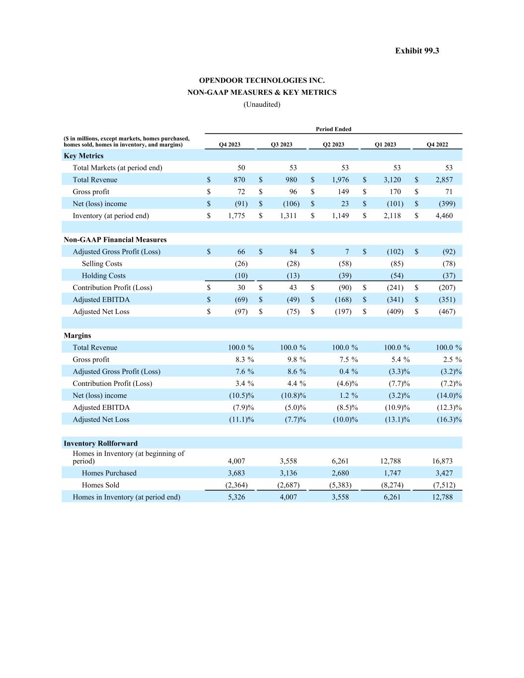 OPENDOOR TECHNOLOGIES INC. NON-GAAP MEASURES & KEY METRICS (Unaudited) Period Ended ($ in millions, except markets, homes purchased, homes sold, homes in inventory, and margins) Q4 2023 Q3 2023 Q2 2023 Q1 2023 Q4 2022 Key Metrics Total Markets (at period end) 50 53 53 53 53 Total Revenue $ 870 $ 980 $ 1,976 $ 3,120 $ 2,857 Gross profit $ 72 $ 96 $ 149 $ 170 $ 71 Net (loss) income $ (91) $ (106) $ 23 $ (101) $ (399) Inventory (at period end) $ 1,775 $ 1,311 $ 1,149 $ 2,118 $ 4,460 Non-GAAP Financial Measures Adjusted Gross Profit (Loss) $ 66 $ 84 $ 7 $ (102) $ (92) Selling Costs (26) (28) (58) (85) (78) Holding Costs (10) (13) (39) (54) (37) Contribution Profit (Loss) $ 30 $ 43 $ (90) $ (241) $ (207) Adjusted EBITDA $ (69) $ (49) $ (168) $ (341) $ (351) Adjusted Net Loss $ (97) $ (75) $ (197) $ (409) $ (467) Margins Total Revenue 100.0 % 100.0 % 100.0 % 100.0 % 100.0 % Gross profit 8.3 % 9.8 % 7.5 % 5.4 % 2.5 % Adjusted Gross Profit (Loss) 7.6 % 8.6 % 0.4 % (3.3) % (3.2) % Contribution Profit (Loss) 3.4 % 4.4 % (4.6) % (7.7) % (7.2) % Net (loss) income (10.5) % (10.8) % 1.2 % (3.2) % (14.0) % Adjusted EBITDA (7.9) % (5.0) % (8.5) % (10.9) % (12.3) % Adjusted Net Loss (11.1) % (7.7) % (10.0) % (13.1) % (16.3) % Inventory Rollforward Homes in Inventory (at beginning of period) 4,007 3,558 6,261 12,788 16,873 Homes Purchased 3,683 3,136 2,680 1,747 3,427 Homes Sold (2,364) (2,687) (5,383) (8,274) (7,512) Homes in Inventory (at period end) 5,326 4,007 3,558 6,261 12,788 Exhibit 99.3