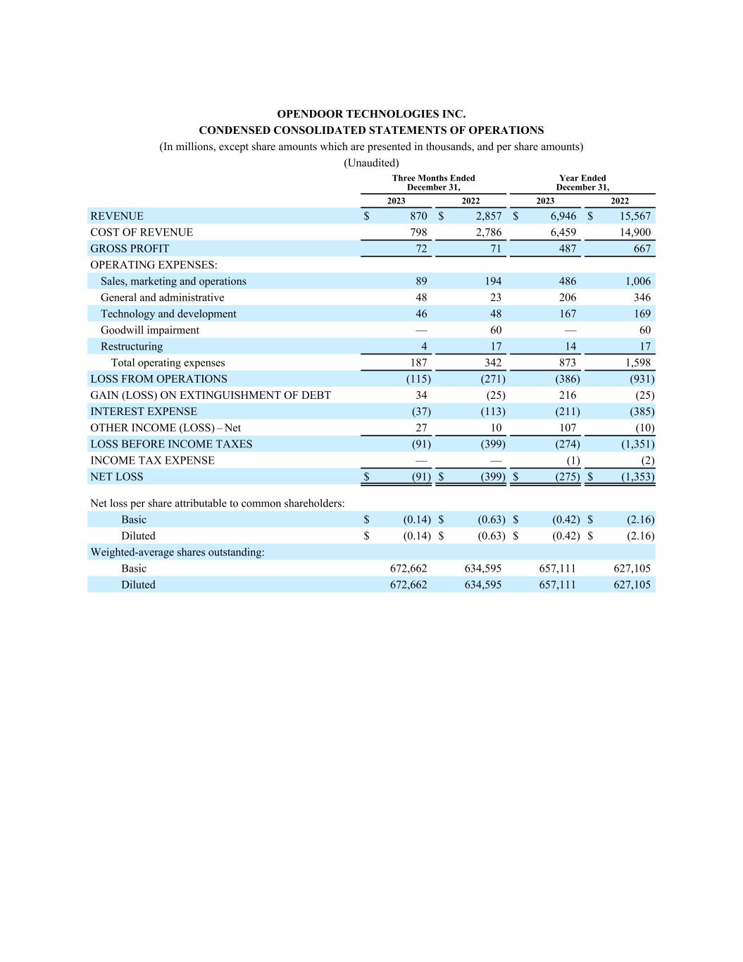 OPENDOOR TECHNOLOGIES INC. CONDENSED CONSOLIDATED STATEMENTS OF OPERATIONS (In millions, except share amounts which are presented in thousands, and per share amounts) (Unaudited) Three Months Ended December 31, Year Ended December 31, 2023 2022 2023 2022 REVENUE $ 870 $ 2,857 $ 6,946 $ 15,567 COST OF REVENUE 798 2,786 6,459 14,900 GROSS PROFIT 72 71 487 667 OPERATING EXPENSES: Sales, marketing and operations 89 194 486 1,006 General and administrative 48 23 206 346 Technology and development 46 48 167 169 Goodwill impairment — 60 — 60 Restructuring 4 17 14 17 Total operating expenses 187 342 873 1,598 LOSS FROM OPERATIONS (115) (271) (386) (931) GAIN (LOSS) ON EXTINGUISHMENT OF DEBT 34 (25) 216 (25) INTEREST EXPENSE (37) (113) (211) (385) OTHER INCOME (LOSS) – Net 27 10 107 (10) LOSS BEFORE INCOME TAXES (91) (399) (274) (1,351) INCOME TAX EXPENSE — — (1) (2) NET LOSS $ (91) $ (399) $ (275) $ (1,353) Net loss per share attributable to common shareholders: Basic $ (0.14) $ (0.63) $ (0.42) $ (2.16) Diluted $ (0.14) $ (0.63) $ (0.42) $ (2.16) Weighted-average shares outstanding: Basic 672,662 634,595 657,111 627,105 Diluted 672,662 634,595 657,111 627,105