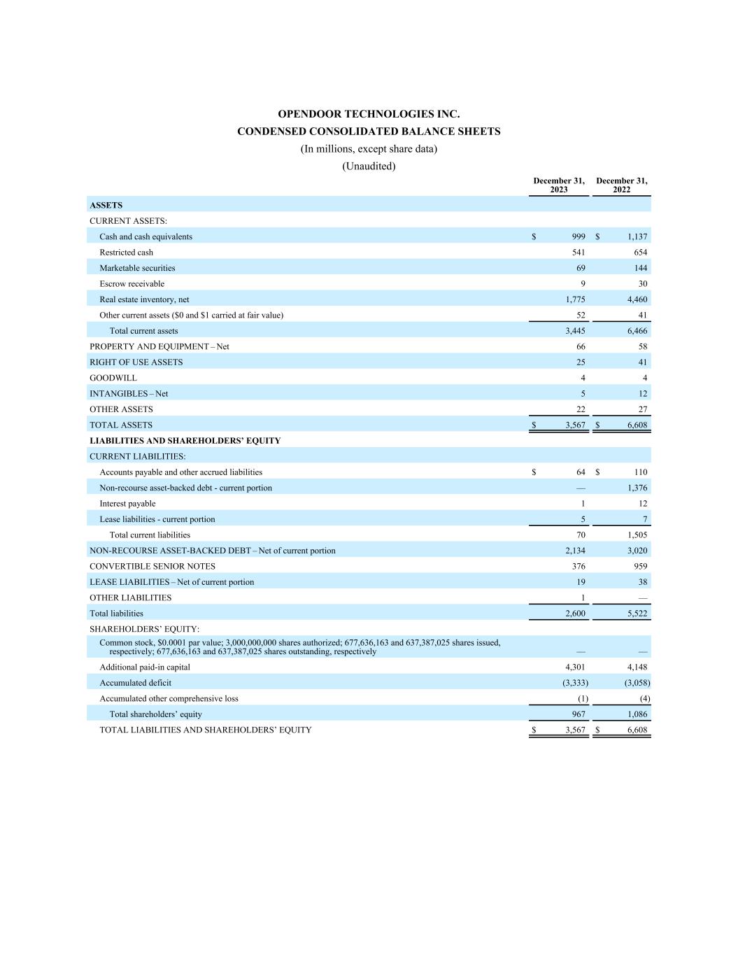 OPENDOOR TECHNOLOGIES INC. CONDENSED CONSOLIDATED BALANCE SHEETS (In millions, except share data) (Unaudited) December 31, 2023 December 31, 2022 ASSETS CURRENT ASSETS: Cash and cash equivalents $ 999 $ 1,137 Restricted cash 541 654 Marketable securities 69 144 Escrow receivable 9 30 Real estate inventory, net 1,775 4,460 Other current assets ($0 and $1 carried at fair value) 52 41 Total current assets 3,445 6,466 PROPERTY AND EQUIPMENT – Net 66 58 RIGHT OF USE ASSETS 25 41 GOODWILL 4 4 INTANGIBLES – Net 5 12 OTHER ASSETS 22 27 TOTAL ASSETS $ 3,567 $ 6,608 LIABILITIES AND SHAREHOLDERS’ EQUITY CURRENT LIABILITIES: Accounts payable and other accrued liabilities $ 64 $ 110 Non-recourse asset-backed debt - current portion — 1,376 Interest payable 1 12 Lease liabilities - current portion 5 7 Total current liabilities 70 1,505 NON-RECOURSE ASSET-BACKED DEBT – Net of current portion 2,134 3,020 CONVERTIBLE SENIOR NOTES 376 959 LEASE LIABILITIES – Net of current portion 19 38 OTHER LIABILITIES 1 — Total liabilities 2,600 5,522 SHAREHOLDERS’ EQUITY: Common stock, $0.0001 par value; 3,000,000,000 shares authorized; 677,636,163 and 637,387,025 shares issued, respectively; 677,636,163 and 637,387,025 shares outstanding, respectively — — Additional paid-in capital 4,301 4,148 Accumulated deficit (3,333) (3,058) Accumulated other comprehensive loss (1) (4) Total shareholders’ equity 967 1,086 TOTAL LIABILITIES AND SHAREHOLDERS’ EQUITY $ 3,567 $ 6,608