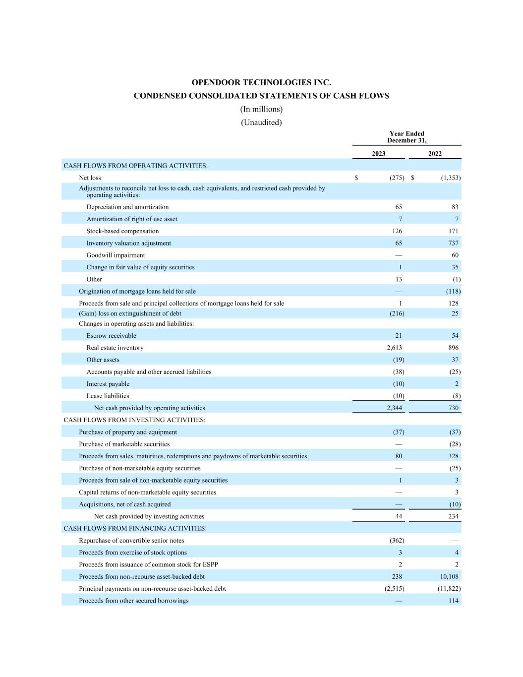 OPENDOOR TECHNOLOGIES INC. CONDENSED CONSOLIDATED STATEMENTS OF CASH FLOWS (In millions) (Unaudited) Year Ended December 31, 2023 2022 CASH FLOWS FROM OPERATING ACTIVITIES: Net loss $ (275) $ (1,353) Adjustments to reconcile net loss to cash, cash equivalents, and restricted cash provided by operating activities: Depreciation and amortization  65 83 Amortization of right of use asset 7 7 Stock-based compensation 126 171 Inventory valuation adjustment 65 737 Goodwill impairment — 60 Change in fair value of equity securities 1 35 Other 13 (1) Origination of mortgage loans held for sale — (118) Proceeds from sale and principal collections of mortgage loans held for sale 1 128 (Gain) loss on extinguishment of debt (216) 25 Changes in operating assets and liabilities: Escrow receivable 21 54 Real estate inventory 2,613 896 Other assets (19) 37 Accounts payable and other accrued liabilities (38) (25) Interest payable (10) 2 Lease liabilities (10) (8) Net cash provided by operating activities 2,344 730 CASH FLOWS FROM INVESTING ACTIVITIES: Purchase of property and equipment (37) (37) Purchase of marketable securities — (28) Proceeds from sales, maturities, redemptions and paydowns of marketable securities 80 328 Purchase of non-marketable equity securities — (25) Proceeds from sale of non-marketable equity securities 1 3 Capital returns of non-marketable equity securities — 3 Acquisitions, net of cash acquired — (10) Net cash provided by investing activities 44 234 CASH FLOWS FROM FINANCING ACTIVITIES: Repurchase of convertible senior notes (362) — Proceeds from exercise of stock options 3 4 Proceeds from issuance of common stock for ESPP 2 2 Proceeds from non-recourse asset-backed debt 238 10,108 Principal payments on non-recourse asset-backed debt (2,515) (11,822) Proceeds from other secured borrowings — 114