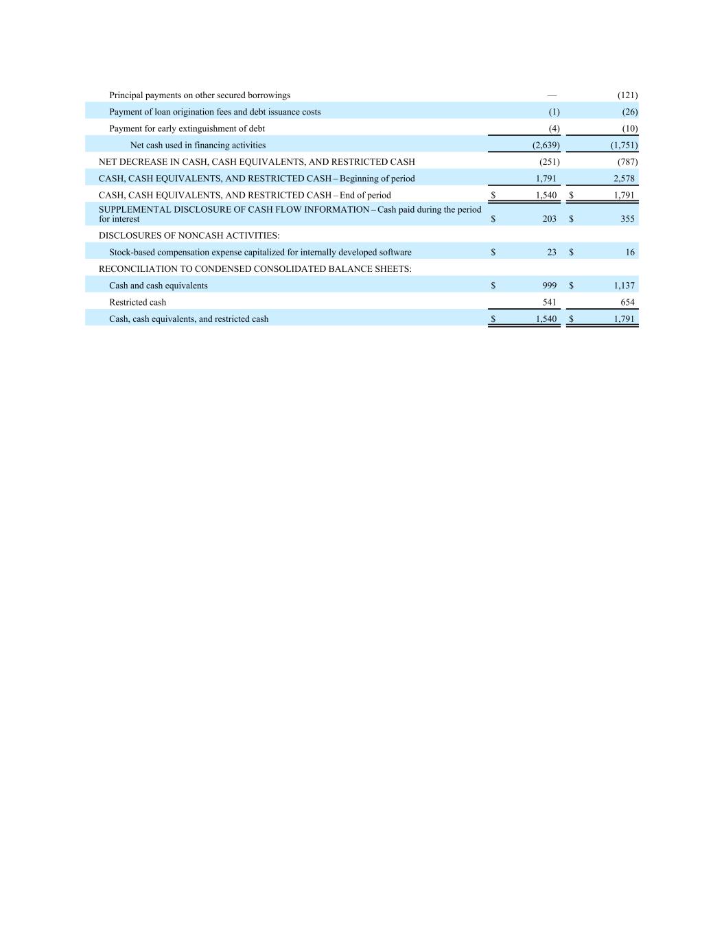 Principal payments on other secured borrowings — (121) Payment of loan origination fees and debt issuance costs (1) (26) Payment for early extinguishment of debt (4) (10) Net cash used in financing activities (2,639) (1,751) NET DECREASE IN CASH, CASH EQUIVALENTS, AND RESTRICTED CASH (251) (787) CASH, CASH EQUIVALENTS, AND RESTRICTED CASH – Beginning of period 1,791 2,578 CASH, CASH EQUIVALENTS, AND RESTRICTED CASH – End of period $ 1,540 $ 1,791 SUPPLEMENTAL DISCLOSURE OF CASH FLOW INFORMATION – Cash paid during the period for interest $ 203 $ 355 DISCLOSURES OF NONCASH ACTIVITIES: Stock-based compensation expense capitalized for internally developed software $ 23 $ 16 RECONCILIATION TO CONDENSED CONSOLIDATED BALANCE SHEETS: Cash and cash equivalents $ 999 $ 1,137 Restricted cash 541 654 Cash, cash equivalents, and restricted cash $ 1,540 $ 1,791