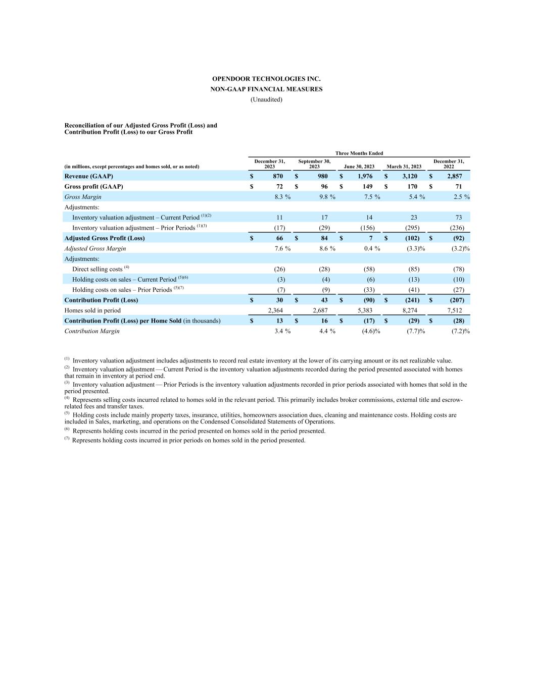 OPENDOOR TECHNOLOGIES INC. NON-GAAP FINANCIAL MEASURES (Unaudited) Reconciliation of our Adjusted Gross Profit (Loss) and Contribution Profit (Loss) to our Gross Profit Three Months Ended (in millions, except percentages and homes sold, or as noted) December 31, 2023 September 30, 2023 June 30, 2023 March 31, 2023 December 31, 2022 Revenue (GAAP) $ 870 $ 980 $ 1,976 $ 3,120 $ 2,857 Gross profit (GAAP) $ 72 $ 96 $ 149 $ 170 $ 71 Gross Margin 8.3 % 9.8 % 7.5 % 5.4 % 2.5 % Adjustments: Inventory valuation adjustment – Current Period͏ (1)(2) 11 17 14 23 73 Inventory valuation adjustment – Prior Periods͏ (1)(3) (17) (29) (156) (295) (236) Adjusted Gross Profit (Loss) $ 66 $ 84 $ 7 $ (102) $ (92) Adjusted Gross Margin 7.6 % 8.6 % 0.4 % (3.3) % (3.2) % Adjustments: Direct selling costs (4) (26) (28) (58) (85) (78) Holding costs on sales – Current Period͏ (5)(6) (3) (4) (6) (13) (10) Holding costs on sales – Prior Periods͏ (5)(7) (7) (9) (33) (41) (27) Contribution Profit (Loss) $ 30 $ 43 $ (90) $ (241) $ (207) Homes sold in period 2,364 2,687 5,383 8,274 7,512 Contribution Profit (Loss) per Home Sold (in thousands) $ 13 $ 16 $ (17) $ (29) $ (28) Contribution Margin 3.4 % 4.4 % (4.6) % (7.7) % (7.2) % (1) Inventory valuation adjustment includes adjustments to record real estate inventory at the lower of its carrying amount or its net realizable value. (2) Inventory valuation adjustment — Current Period is the inventory valuation adjustments recorded during the period presented associated with homes that remain in inventory at period end. (3) Inventory valuation adjustment — Prior Periods is the inventory valuation adjustments recorded in prior periods associated with homes that sold in the period presented. (4) Represents selling costs incurred related to homes sold in the relevant period. This primarily includes broker commissions, external title and escrow- related fees and transfer taxes. (5) Holding costs include mainly property taxes, insurance, utilities, homeowners association dues, cleaning and maintenance costs. Holding costs are included in Sales, marketing, and operations on the Condensed Consolidated Statements of Operations. (6) Represents holding costs incurred in the period presented on homes sold in the period presented. (7) Represents holding costs incurred in prior periods on homes sold in the period presented.