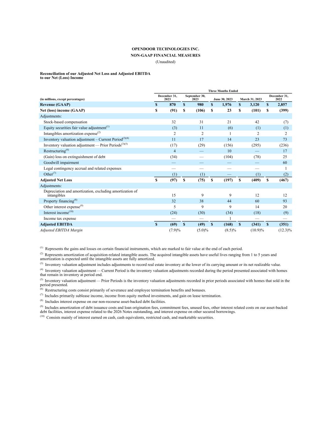 OPENDOOR TECHNOLOGIES INC. NON-GAAP FINANCIAL MEASURES (Unaudited) Reconciliation of our Adjusted Net Loss and Adjusted EBITDA to our Net (Loss) Income Three Months Ended (in millions, except percentages) December 31, 2023 September 30, 2023 June 30, 2023 March 31, 2023 December 31, 2022 Revenue (GAAP) $ 870 $ 980 $ 1,976 $ 3,120 $ 2,857 Net (loss) income (GAAP) $ (91) $ (106) $ 23 $ (101) $ (399) Adjustments: Stock-based compensation 32 31 21 42 (7) Equity securities fair value adjustment(1) (3) 11 (6) (1) (1) Intangibles amortization expense(2) 2 2 1 2 2 Inventory valuation adjustment – Current Period͏(3)(4) 11 17 14 23 73 Inventory valuation adjustment — Prior Periods͏(3)(5) (17) (29) (156) (295) (236) Restructuring(6) 4 — 10 — 17 (Gain) loss on extinguishment of debt (34) — (104) (78) 25 Goodwill impairment — — — — 60 Legal contingency accrual and related expenses — — — — 1 Other(7) (1) (1) — (1) (2) Adjusted Net Loss $ (97) $ (75) $ (197) $ (409) $ (467) Adjustments: Depreciation and amortization, excluding amortization of intangibles 15 9 9 12 12 Property financing(8) 32 38 44 60 93 Other interest expense(9) 5 9 9 14 20 Interest income(10) (24) (30) (34) (18) (9) Income tax expense — — 1 — — Adjusted EBITDA $ (69) $ (49) $ (168) $ (341) $ (351) Adjusted EBITDA Margin (7.9) % (5.0) % (8.5) % (10.9) % (12.3) % (1) Represents the gains and losses on certain financial instruments, which are marked to fair value at the end of each period. (2) Represents amortization of acquisition-related intangible assets. The acquired intangible assets have useful lives ranging from 1 to 5 years and amortization is expected until the intangible assets are fully amortized. (3) Inventory valuation adjustment includes adjustments to record real estate inventory at the lower of its carrying amount or its net realizable value. (4) Inventory valuation adjustment — Current Period is the inventory valuation adjustments recorded during the period presented associated with homes that remain in inventory at period end. (5) Inventory valuation adjustment — Prior Periods is the inventory valuation adjustments recorded in prior periods associated with homes that sold in the period presented. (6) Restructuring costs consist primarily of severance and employee termination benefits and bonuses. (7) Includes primarily sublease income, income from equity method investments, and gain on lease termination. (8) Includes interest expense on our non-recourse asset-backed debt facilities. (9) Includes amortization of debt issuance costs and loan origination fees, commitment fees, unused fees, other interest related costs on our asset-backed debt facilities, interest expense related to the 2026 Notes outstanding, and interest expense on other secured borrowings. (10) Consists mainly of interest earned on cash, cash equivalents, restricted cash, and marketable securities.