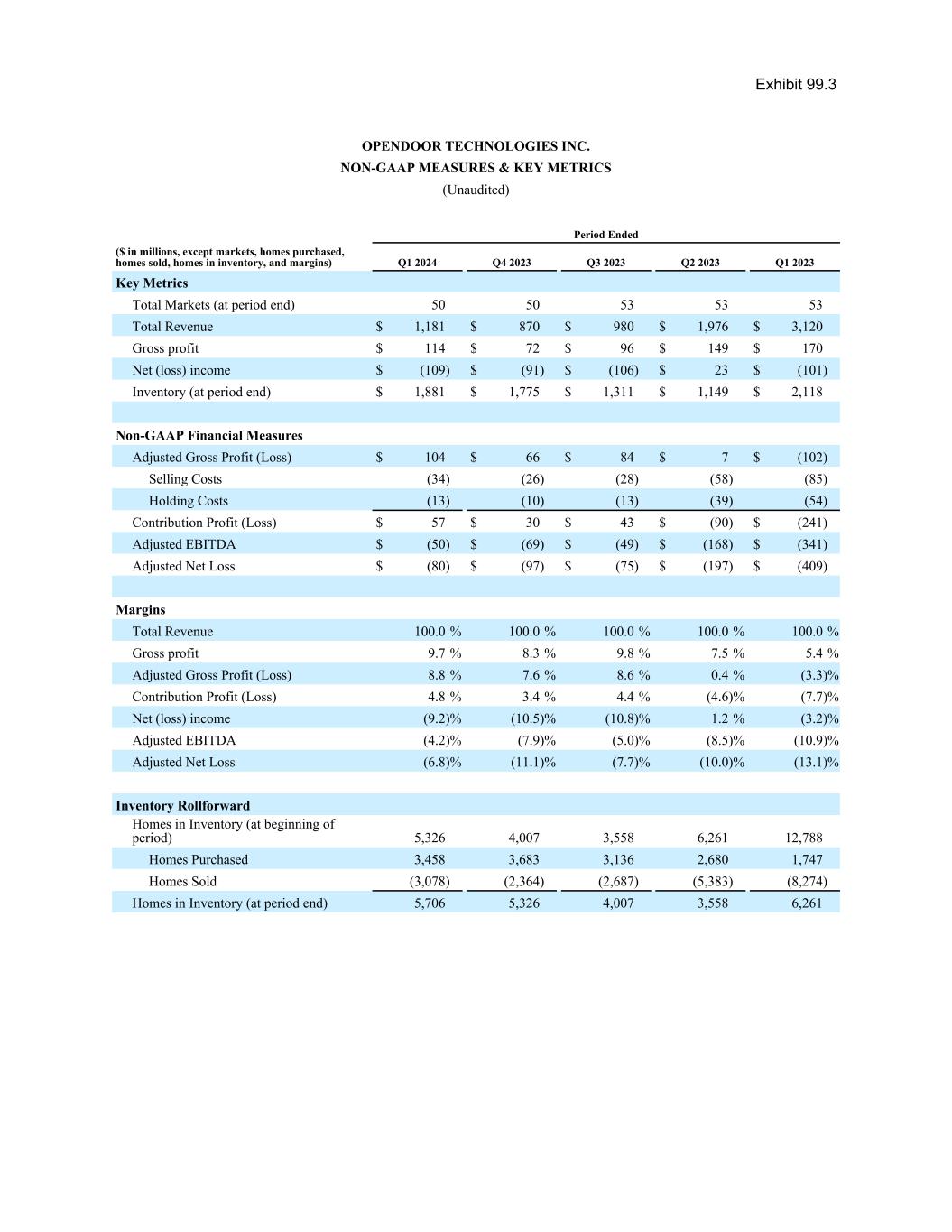 OPENDOOR TECHNOLOGIES INC. NON-GAAP MEASURES & KEY METRICS (Unaudited) Period Ended ($ in millions, except markets, homes purchased, homes sold, homes in inventory, and margins) Q1 2024 Q4 2023 Q3 2023 Q2 2023 Q1 2023 Key Metrics Total Markets (at period end) 50 50 53 53 53 Total Revenue $ 1,181 $ 870 $ 980 $ 1,976 $ 3,120 Gross profit $ 114 $ 72 $ 96 $ 149 $ 170 Net (loss) income $ (109) $ (91) $ (106) $ 23 $ (101) Inventory (at period end) $ 1,881 $ 1,775 $ 1,311 $ 1,149 $ 2,118 Non-GAAP Financial Measures Adjusted Gross Profit (Loss) $ 104 $ 66 $ 84 $ 7 $ (102) Selling Costs (34) (26) (28) (58) (85) Holding Costs (13) (10) (13) (39) (54) Contribution Profit (Loss) $ 57 $ 30 $ 43 $ (90) $ (241) Adjusted EBITDA $ (50) $ (69) $ (49) $ (168) $ (341) Adjusted Net Loss $ (80) $ (97) $ (75) $ (197) $ (409) Margins Total Revenue 100.0 % 100.0 % 100.0 % 100.0 % 100.0 % Gross profit 9.7 % 8.3 % 9.8 % 7.5 % 5.4 % Adjusted Gross Profit (Loss) 8.8 % 7.6 % 8.6 % 0.4 % (3.3) % Contribution Profit (Loss) 4.8 % 3.4 % 4.4 % (4.6) % (7.7) % Net (loss) income (9.2) % (10.5) % (10.8) % 1.2 % (3.2) % Adjusted EBITDA (4.2) % (7.9) % (5.0) % (8.5) % (10.9) % Adjusted Net Loss (6.8) % (11.1) % (7.7) % (10.0) % (13.1) % Inventory Rollforward Homes in Inventory (at beginning of period) 5,326 4,007 3,558 6,261 12,788 Homes Purchased 3,458 3,683 3,136 2,680 1,747 Homes Sold (3,078) (2,364) (2,687) (5,383) (8,274) Homes in Inventory (at period end) 5,706 5,326 4,007 3,558 6,261 Exhibit 99.3