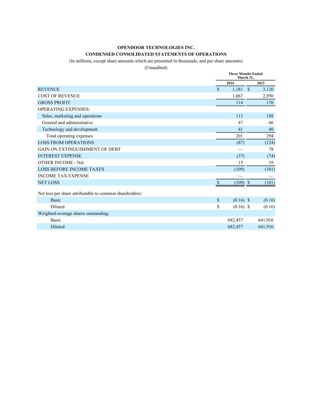 OPENDOOR TECHNOLOGIES INC. CONDENSED CONSOLIDATED STATEMENTS OF OPERATIONS (In millions, except share amounts which are presented in thousands, and per share amounts) (Unaudited) Three Months Ended March 31, 2024 2023 REVENUE $ 1,181 $ 3,120 COST OF REVENUE 1,067 2,950 GROSS PROFIT 114 170 OPERATING EXPENSES: Sales, marketing and operations 113 188 General and administrative 47 66 Technology and development 41 40 Total operating expenses 201 294 LOSS FROM OPERATIONS (87) (124) GAIN ON EXTINGUISHMENT OF DEBT — 78 INTEREST EXPENSE (37) (74) OTHER INCOME – Net 15 19 LOSS BEFORE INCOME TAXES (109) (101) INCOME TAX EXPENSE — — NET LOSS $ (109) $ (101) Net loss per share attributable to common shareholders: Basic $ (0.16) $ (0.16) Diluted $ (0.16) $ (0.16) Weighted-average shares outstanding: Basic 682,457 641,916 Diluted 682,457 641,916