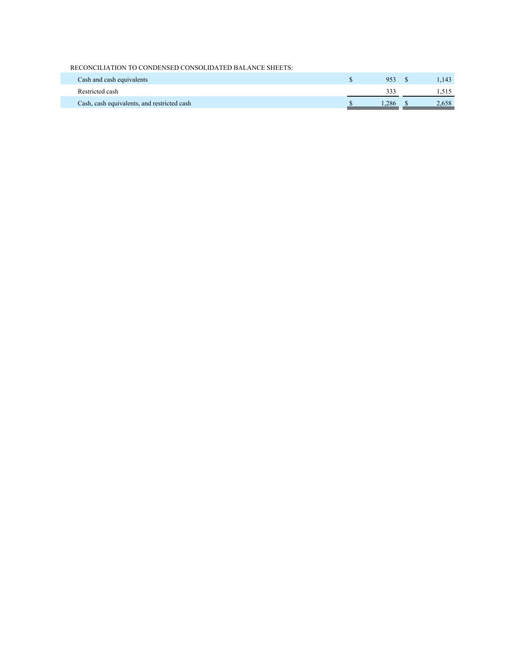 RECONCILIATION TO CONDENSED CONSOLIDATED BALANCE SHEETS: Cash and cash equivalents $ 953 $ 1,143 Restricted cash 333 1,515 Cash, cash equivalents, and restricted cash $ 1,286 $ 2,658