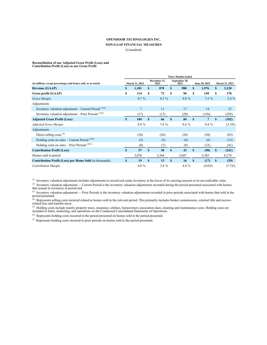 OPENDOOR TECHNOLOGIES INC. NON-GAAP FINANCIAL MEASURES (Unaudited) Reconciliation of our Adjusted Gross Profit (Loss) and Contribution Profit (Loss) to our Gross Profit Three Months Ended (in millions, except percentages and homes sold, or as noted) March 31, 2024 December 31, 2023 September 30, 2023 June 30, 2023 March 31, 2023 Revenue (GAAP) $ 1,181 $ 870 $ 980 $ 1,976 $ 3,120 Gross profit (GAAP) $ 114 $ 72 $ 96 $ 149 $ 170 Gross Margin 9.7 % 8.3 % 9.8 % 7.5 % 5.4 % Adjustments: Inventory valuation adjustment – Current Period͏ (1)(2) 7 11 17 14 23 Inventory valuation adjustment – Prior Periods͏ (1)(3) (17) (17) (29) (156) (295) Adjusted Gross Profit (Loss) $ 104 $ 66 $ 84 $ 7 $ (102) Adjusted Gross Margin 8.8 % 7.6 % 8.6 % 0.4 % (3.3) % Adjustments: Direct selling costs (4) (34) (26) (28) (58) (85) Holding costs on sales – Current Period͏ (5)(6) (5) (3) (4) (6) (13) Holding costs on sales – Prior Periods͏ (5)(7) (8) (7) (9) (33) (41) Contribution Profit (Loss) $ 57 $ 30 $ 43 $ (90) $ (241) Homes sold in period 3,078 2,364 2,687 5,383 8,274 Contribution Profit (Loss) per Home Sold (in thousands) $ 19 $ 13 $ 16 $ (17) $ (29) Contribution Margin 4.8 % 3.4 % 4.4 % (4.6) % (7.7) % (1) Inventory valuation adjustment includes adjustments to record real estate inventory at the lower of its carrying amount or its net realizable value. (2) Inventory valuation adjustment — Current Period is the inventory valuation adjustments recorded during the period presented associated with homes that remain in inventory at period end. (3) Inventory valuation adjustment — Prior Periods is the inventory valuation adjustments recorded in prior periods associated with homes that sold in the period presented. (4) Represents selling costs incurred related to homes sold in the relevant period. This primarily includes broker commissions, external title and escrow- related fees and transfer taxes. (5) Holding costs include mainly property taxes, insurance, utilities, homeowners association dues, cleaning and maintenance costs. Holding costs are included in Sales, marketing, and operations on the Condensed Consolidated Statements of Operations. (6) Represents holding costs incurred in the period presented on homes sold in the period presented. (7) Represents holding costs incurred in prior periods on homes sold in the period presented.