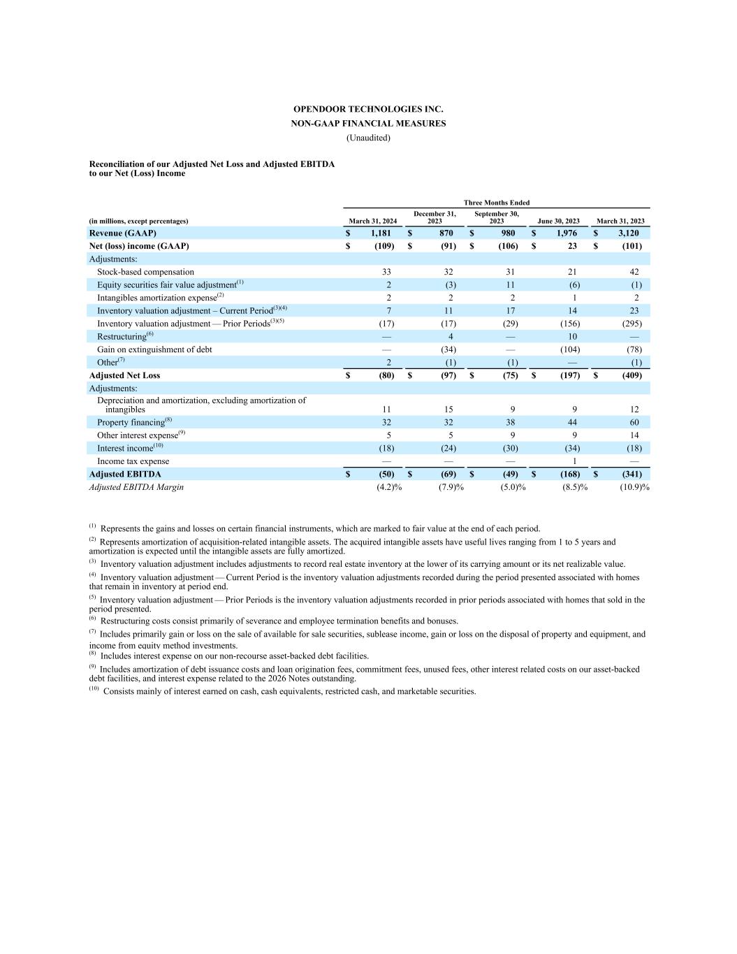 OPENDOOR TECHNOLOGIES INC. NON-GAAP FINANCIAL MEASURES (Unaudited) Reconciliation of our Adjusted Net Loss and Adjusted EBITDA to our Net (Loss) Income Three Months Ended (in millions, except percentages) March 31, 2024 December 31, 2023 September 30, 2023 June 30, 2023 March 31, 2023 Revenue (GAAP) $ 1,181 $ 870 $ 980 $ 1,976 $ 3,120 Net (loss) income (GAAP) $ (109) $ (91) $ (106) $ 23 $ (101) Adjustments: Stock-based compensation 33 32 31 21 42 Equity securities fair value adjustment(1) 2 (3) 11 (6) (1) Intangibles amortization expense(2) 2 2 2 1 2 Inventory valuation adjustment – Current Period͏(3)(4) 7 11 17 14 23 Inventory valuation adjustment — Prior Periods͏(3)(5) (17) (17) (29) (156) (295) Restructuring(6) — 4 — 10 — Gain on extinguishment of debt — (34) — (104) (78) Other(7) 2 (1) (1) — (1) Adjusted Net Loss $ (80) $ (97) $ (75) $ (197) $ (409) Adjustments: Depreciation and amortization, excluding amortization of intangibles 11 15 9 9 12 Property financing(8) 32 32 38 44 60 Other interest expense(9) 5 5 9 9 14 Interest income(10) (18) (24) (30) (34) (18) Income tax expense — — — 1 — Adjusted EBITDA $ (50) $ (69) $ (49) $ (168) $ (341) Adjusted EBITDA Margin (4.2) % (7.9) % (5.0) % (8.5) % (10.9) % (1) Represents the gains and losses on certain financial instruments, which are marked to fair value at the end of each period. (2) Represents amortization of acquisition-related intangible assets. The acquired intangible assets have useful lives ranging from 1 to 5 years and amortization is expected until the intangible assets are fully amortized. (3) Inventory valuation adjustment includes adjustments to record real estate inventory at the lower of its carrying amount or its net realizable value. (4) Inventory valuation adjustment — Current Period is the inventory valuation adjustments recorded during the period presented associated with homes that remain in inventory at period end. (5) Inventory valuation adjustment — Prior Periods is the inventory valuation adjustments recorded in prior periods associated with homes that sold in the period presented. (6) Restructuring costs consist primarily of severance and employee termination benefits and bonuses. (7) Includes primarily gain or loss on the sale of available for sale securities, sublease income, gain or loss on the disposal of property and equipment, and income from equity method investments. (8) Includes interest expense on our non-recourse asset-backed debt facilities. (9) Includes amortization of debt issuance costs and loan origination fees, commitment fees, unused fees, other interest related costs on our asset-backed debt facilities, and interest expense related to the 2026 Notes outstanding. (10) Consists mainly of interest earned on cash, cash equivalents, restricted cash, and marketable securities.