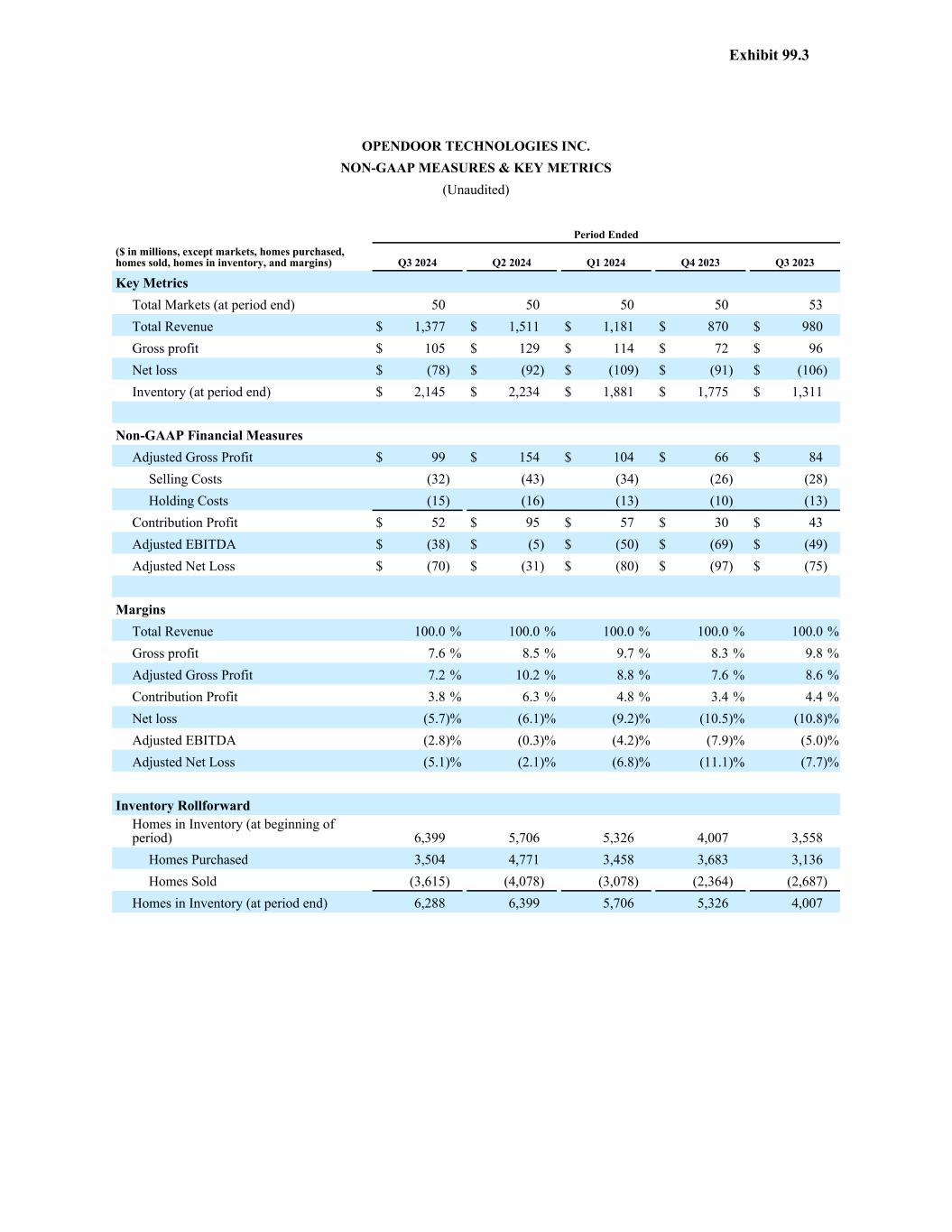 OPENDOOR TECHNOLOGIES INC. NON-GAAP MEASURES & KEY METRICS (Unaudited) Period Ended ($ in millions, except markets, homes purchased, homes sold, homes in inventory, and margins) Q3 2024 Q2 2024 Q1 2024 Q4 2023 Q3 2023 Key Metrics Total Markets (at period end) 50 50 50 50 53 Total Revenue $ 1,377 $ 1,511 $ 1,181 $ 870 $ 980 Gross profit $ 105 $ 129 $ 114 $ 72 $ 96 Net loss $ (78) $ (92) $ (109) $ (91) $ (106) Inventory (at period end) $ 2,145 $ 2,234 $ 1,881 $ 1,775 $ 1,311 Non-GAAP Financial Measures Adjusted Gross Profit $ 99 $ 154 $ 104 $ 66 $ 84 Selling Costs (32) (43) (34) (26) (28) Holding Costs (15) (16) (13) (10) (13) Contribution Profit $ 52 $ 95 $ 57 $ 30 $ 43 Adjusted EBITDA $ (38) $ (5) $ (50) $ (69) $ (49) Adjusted Net Loss $ (70) $ (31) $ (80) $ (97) $ (75) Margins Total Revenue 100.0 % 100.0 % 100.0 % 100.0 % 100.0 % Gross profit 7.6 % 8.5 % 9.7 % 8.3 % 9.8 % Adjusted Gross Profit 7.2 % 10.2 % 8.8 % 7.6 % 8.6 % Contribution Profit 3.8 % 6.3 % 4.8 % 3.4 % 4.4 % Net loss (5.7) % (6.1) % (9.2) % (10.5) % (10.8) % Adjusted EBITDA (2.8) % (0.3) % (4.2) % (7.9) % (5.0) % Adjusted Net Loss (5.1) % (2.1) % (6.8) % (11.1) % (7.7) % Inventory Rollforward Homes in Inventory (at beginning of period) 6,399 5,706 5,326 4,007 3,558 Homes Purchased 3,504 4,771 3,458 3,683 3,136 Homes Sold (3,615) (4,078) (3,078) (2,364) (2,687) Homes in Inventory (at period end) 6,288 6,399 5,706 5,326 4,007 Exhibit 99.3