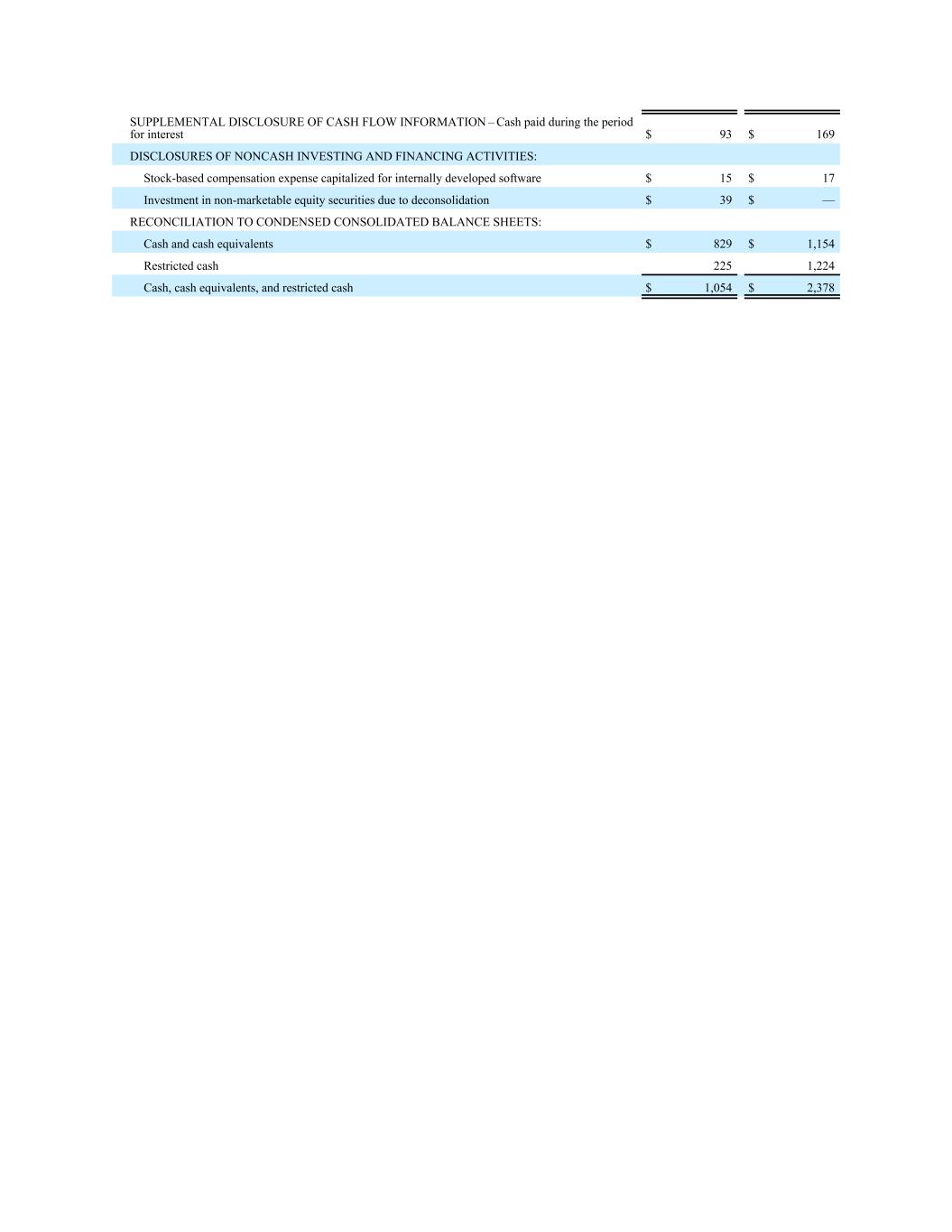 SUPPLEMENTAL DISCLOSURE OF CASH FLOW INFORMATION – Cash paid during the period for interest $ 93 $ 169 DISCLOSURES OF NONCASH INVESTING AND FINANCING ACTIVITIES: Stock-based compensation expense capitalized for internally developed software $ 15 $ 17 Investment in non-marketable equity securities due to deconsolidation $ 39 $ — RECONCILIATION TO CONDENSED CONSOLIDATED BALANCE SHEETS: Cash and cash equivalents $ 829 $ 1,154 Restricted cash 225 1,224 Cash, cash equivalents, and restricted cash $ 1,054 $ 2,378
