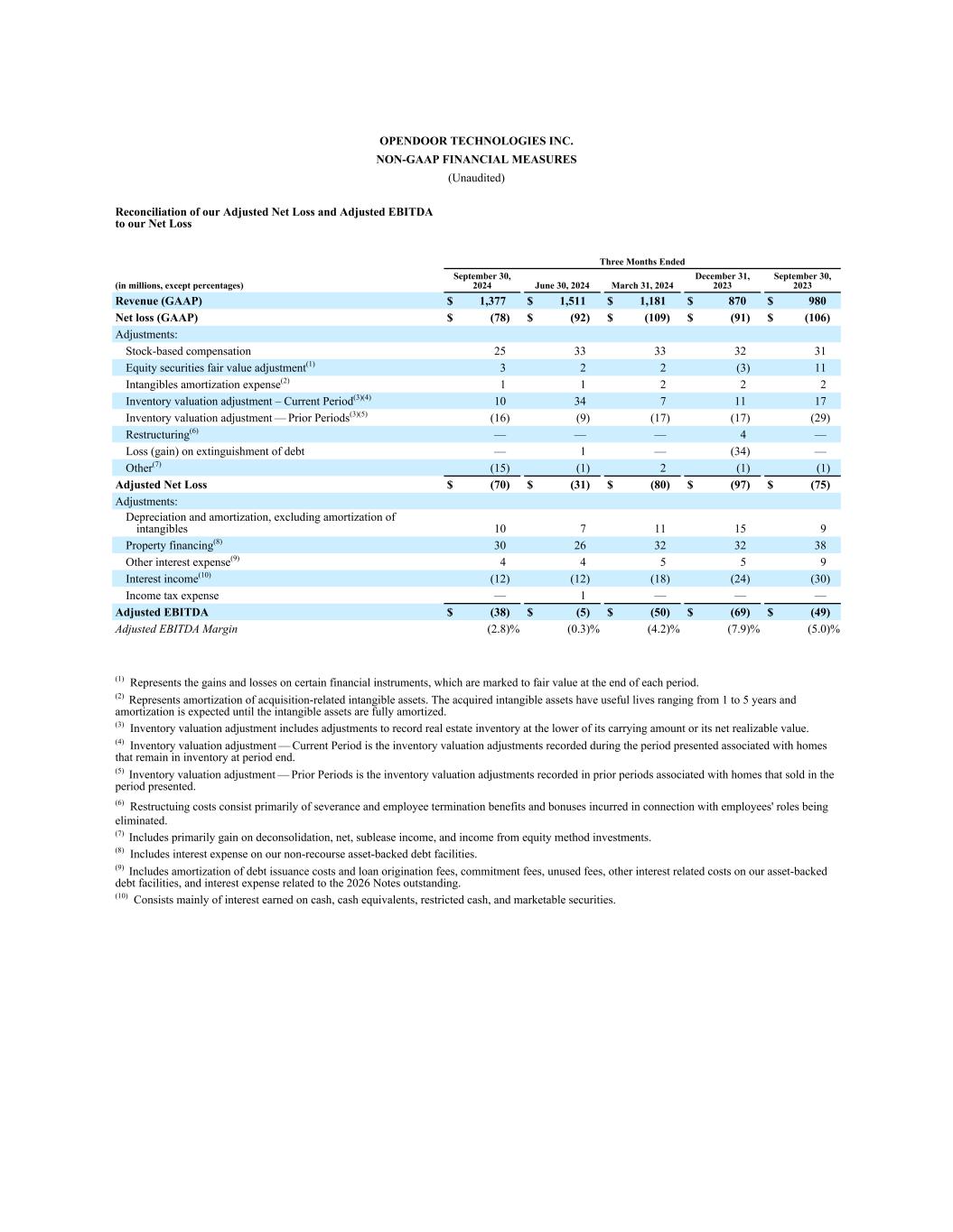 OPENDOOR TECHNOLOGIES INC. NON-GAAP FINANCIAL MEASURES (Unaudited) Reconciliation of our Adjusted Net Loss and Adjusted EBITDA to our Net Loss Three Months Ended (in millions, except percentages) September 30, 2024 June 30, 2024 March 31, 2024 December 31, 2023 September 30, 2023 Revenue (GAAP) $ 1,377 $ 1,511 $ 1,181 $ 870 $ 980 Net loss (GAAP) $ (78) $ (92) $ (109) $ (91) $ (106) Adjustments: Stock-based compensation 25 33 33 32 31 Equity securities fair value adjustment(1) 3 2 2 (3) 11 Intangibles amortization expense(2) 1 1 2 2 2 Inventory valuation adjustment – Current Period͏(3)(4) 10 34 7 11 17 Inventory valuation adjustment — Prior Periods͏(3)(5) (16) (9) (17) (17) (29) Restructuring(6) — — — 4 — Loss (gain) on extinguishment of debt — 1 — (34) — Other(7) (15) (1) 2 (1) (1) Adjusted Net Loss $ (70) $ (31) $ (80) $ (97) $ (75) Adjustments: Depreciation and amortization, excluding amortization of intangibles 10 7 11 15 9 Property financing(8) 30 26 32 32 38 Other interest expense(9) 4 4 5 5 9 Interest income(10) (12) (12) (18) (24) (30) Income tax expense — 1 — — — Adjusted EBITDA $ (38) $ (5) $ (50) $ (69) $ (49) Adjusted EBITDA Margin (2.8) % (0.3) % (4.2) % (7.9) % (5.0) % (1) Represents the gains and losses on certain financial instruments, which are marked to fair value at the end of each period. (2) Represents amortization of acquisition-related intangible assets. The acquired intangible assets have useful lives ranging from 1 to 5 years and amortization is expected until the intangible assets are fully amortized. (3) Inventory valuation adjustment includes adjustments to record real estate inventory at the lower of its carrying amount or its net realizable value. (4) Inventory valuation adjustment — Current Period is the inventory valuation adjustments recorded during the period presented associated with homes that remain in inventory at period end. (5) Inventory valuation adjustment — Prior Periods is the inventory valuation adjustments recorded in prior periods associated with homes that sold in the period presented. (6) Restructuing costs consist primarily of severance and employee termination benefits and bonuses incurred in connection with employees' roles being eliminated. (7) Includes primarily gain on deconsolidation, net, sublease income, and income from equity method investments. (8) Includes interest expense on our non-recourse asset-backed debt facilities. (9) Includes amortization of debt issuance costs and loan origination fees, commitment fees, unused fees, other interest related costs on our asset-backed debt facilities, and interest expense related to the 2026 Notes outstanding. (10) Consists mainly of interest earned on cash, cash equivalents, restricted cash, and marketable securities.