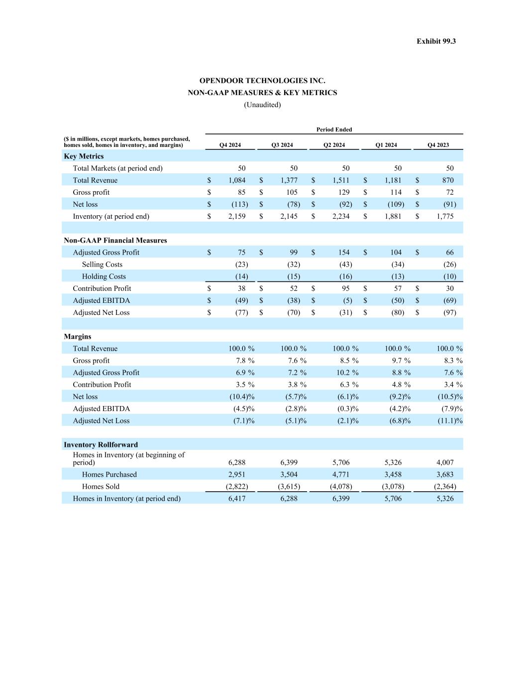 OPENDOOR TECHNOLOGIES INC. NON-GAAP MEASURES & KEY METRICS (Unaudited) Period Ended ($ in millions, except markets, homes purchased, homes sold, homes in inventory, and margins) Q4 2024 Q3 2024 Q2 2024 Q1 2024 Q4 2023 Key Metrics Total Markets (at period end) 50 50 50 50 50 Total Revenue $ 1,084 $ 1,377 $ 1,511 $ 1,181 $ 870 Gross profit $ 85 $ 105 $ 129 $ 114 $ 72 Net loss $ (113) $ (78) $ (92) $ (109) $ (91) Inventory (at period end) $ 2,159 $ 2,145 $ 2,234 $ 1,881 $ 1,775 Non-GAAP Financial Measures Adjusted Gross Profit $ 75 $ 99 $ 154 $ 104 $ 66 Selling Costs (23) (32) (43) (34) (26) Holding Costs (14) (15) (16) (13) (10) Contribution Profit $ 38 $ 52 $ 95 $ 57 $ 30 Adjusted EBITDA $ (49) $ (38) $ (5) $ (50) $ (69) Adjusted Net Loss $ (77) $ (70) $ (31) $ (80) $ (97) Margins Total Revenue 100.0 % 100.0 % 100.0 % 100.0 % 100.0 % Gross profit 7.8 % 7.6 % 8.5 % 9.7 % 8.3 % Adjusted Gross Profit 6.9 % 7.2 % 10.2 % 8.8 % 7.6 % Contribution Profit 3.5 % 3.8 % 6.3 % 4.8 % 3.4 % Net loss (10.4) % (5.7) % (6.1) % (9.2) % (10.5) % Adjusted EBITDA (4.5) % (2.8) % (0.3) % (4.2) % (7.9) % Adjusted Net Loss (7.1) % (5.1) % (2.1) % (6.8) % (11.1) % Inventory Rollforward Homes in Inventory (at beginning of period) 6,288 6,399 5,706 5,326 4,007 Homes Purchased 2,951 3,504 4,771 3,458 3,683 Homes Sold (2,822) (3,615) (4,078) (3,078) (2,364) Homes in Inventory (at period end) 6,417 6,288 6,399 5,706 5,326 Exhibit 99.3