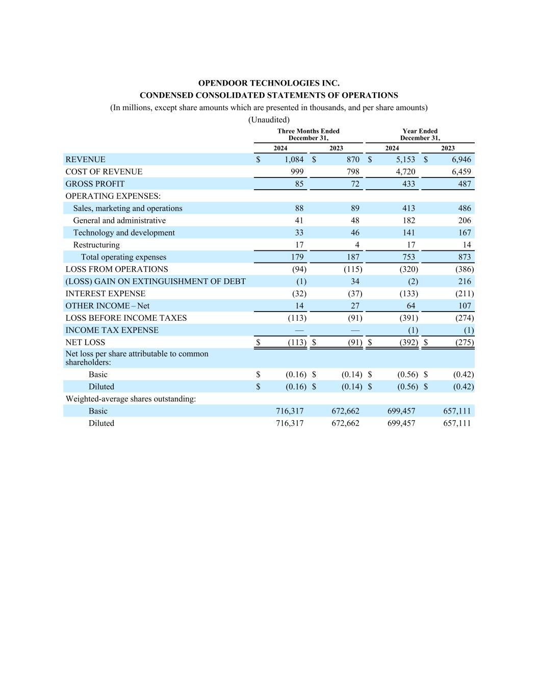 OPENDOOR TECHNOLOGIES INC. CONDENSED CONSOLIDATED STATEMENTS OF OPERATIONS (In millions, except share amounts which are presented in thousands, and per share amounts) (Unaudited) Three Months Ended December 31, Year Ended December 31, 2024 2023 2024 2023 REVENUE $ 1,084 $ 870 $ 5,153 $ 6,946 COST OF REVENUE 999 798 4,720 6,459 GROSS PROFIT 85 72 433 487 OPERATING EXPENSES: Sales, marketing and operations 88 89 413 486 General and administrative 41 48 182 206 Technology and development 33 46 141 167 Restructuring 17 4 17 14 Total operating expenses 179 187 753 873 LOSS FROM OPERATIONS (94) (115) (320) (386) (LOSS) GAIN ON EXTINGUISHMENT OF DEBT (1) 34 (2) 216 INTEREST EXPENSE (32) (37) (133) (211) OTHER INCOME – Net 14 27 64 107 LOSS BEFORE INCOME TAXES (113) (91) (391) (274) INCOME TAX EXPENSE — — (1) (1) NET LOSS $ (113) $ (91) $ (392) $ (275) Net loss per share attributable to common shareholders: Basic $ (0.16) $ (0.14) $ (0.56) $ (0.42) Diluted $ (0.16) $ (0.14) $ (0.56) $ (0.42) Weighted-average shares outstanding: Basic 716,317 672,662 699,457 657,111 Diluted 716,317 672,662 699,457 657,111
