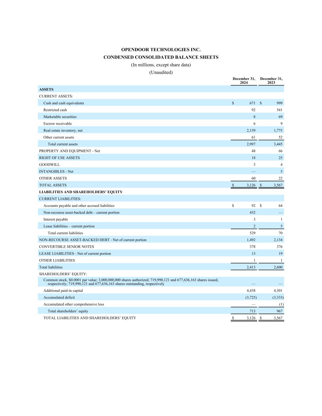 OPENDOOR TECHNOLOGIES INC. CONDENSED CONSOLIDATED BALANCE SHEETS (In millions, except share data) (Unaudited) December 31, 2024 December 31, 2023 ASSETS CURRENT ASSETS: Cash and cash equivalents $ 671 $ 999 Restricted cash 92 541 Marketable securities 8 69 Escrow receivable 6 9 Real estate inventory, net 2,159 1,775 Other current assets 61 52 Total current assets 2,997 3,445 PROPERTY AND EQUIPMENT – Net 48 66 RIGHT OF USE ASSETS 18 25 GOODWILL 3 4 INTANGIBLES – Net — 5 OTHER ASSETS 60 22 TOTAL ASSETS $ 3,126 $ 3,567 LIABILITIES AND SHAREHOLDERS’ EQUITY CURRENT LIABILITIES: Accounts payable and other accrued liabilities $ 92 $ 64 Non-recourse asset-backed debt – current portion 432 — Interest payable 3 1 Lease liabilities – current portion 2 5 Total current liabilities 529 70 NON-RECOURSE ASSET-BACKED DEBT – Net of current portion 1,492 2,134 CONVERTIBLE SENIOR NOTES 378 376 LEASE LIABILITIES – Net of current portion 13 19 OTHER LIABILITIES 1 1 Total liabilities 2,413 2,600 SHAREHOLDERS’ EQUITY: Common stock, $0.0001 par value; 3,000,000,000 shares authorized; 719,990,121 and 677,636,163 shares issued, respectively; 719,990,121 and 677,636,163 shares outstanding, respectively — — Additional paid-in capital 4,438 4,301 Accumulated deficit (3,725) (3,333) Accumulated other comprehensive loss — (1) Total shareholders’ equity 713 967 TOTAL LIABILITIES AND SHAREHOLDERS’ EQUITY $ 3,126 $ 3,567