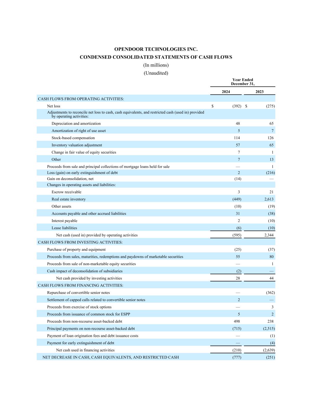 OPENDOOR TECHNOLOGIES INC. CONDENSED CONSOLIDATED STATEMENTS OF CASH FLOWS (In millions) (Unaudited) Year Ended December 31, 2024 2023 CASH FLOWS FROM OPERATING ACTIVITIES: Net loss $ (392) $ (275) Adjustments to reconcile net loss to cash, cash equivalents, and restricted cash (used in) provided by operating activities: Depreciation and amortization  48 65 Amortization of right of use asset 5 7 Stock-based compensation 114 126 Inventory valuation adjustment 57 65 Change in fair value of equity securities 7 1 Other 7 13 Proceeds from sale and principal collections of mortgage loans held for sale — 1 Loss (gain) on early extinguishment of debt 2 (216) Gain on deconsolidation, net (14) — Changes in operating assets and liabilities: Escrow receivable 3 21 Real estate inventory (449) 2,613 Other assets (10) (19) Accounts payable and other accrued liabilities 31 (38) Interest payable 2 (10) Lease liabilities (6) (10) Net cash (used in) provided by operating activities (595) 2,344 CASH FLOWS FROM INVESTING ACTIVITIES: Purchase of property and equipment (25) (37) Proceeds from sales, maturities, redemptions and paydowns of marketable securities 55 80 Proceeds from sale of non-marketable equity securities — 1 Cash impact of deconsolidation of subsidiaries (2) — Net cash provided by investing activities 28 44 CASH FLOWS FROM FINANCING ACTIVITIES: Repurchase of convertible senior notes — (362) Settlement of capped calls related to convertible senior notes 2 — Proceeds from exercise of stock options — 3 Proceeds from issuance of common stock for ESPP 5 2 Proceeds from non-recourse asset-backed debt 498 238 Principal payments on non-recourse asset-backed debt (715) (2,515) Payment of loan origination fees and debt issuance costs — (1) Payment for early extinguishment of debt — (4) Net cash used in financing activities (210) (2,639) NET DECREASE IN CASH, CASH EQUIVALENTS, AND RESTRICTED CASH (777) (251)