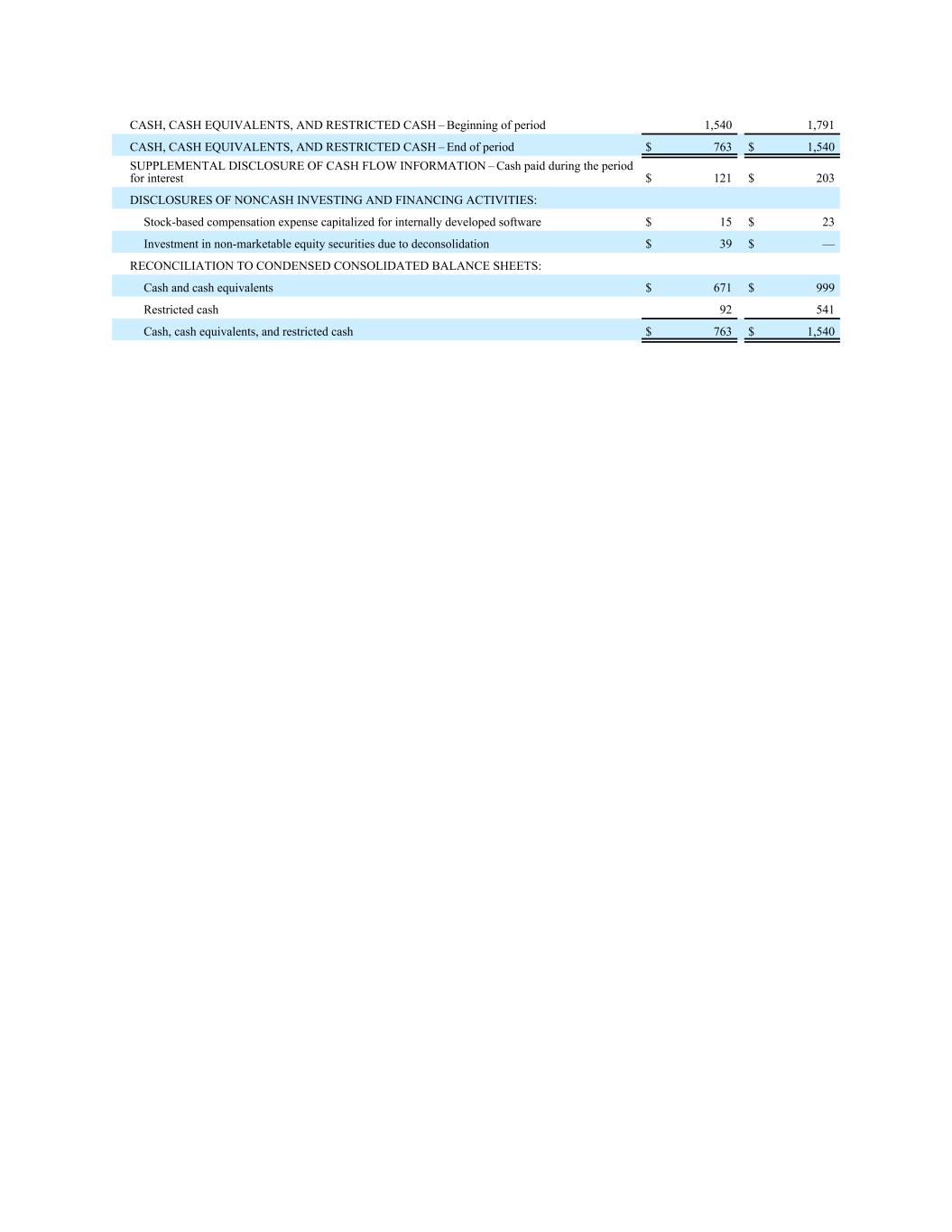 CASH, CASH EQUIVALENTS, AND RESTRICTED CASH – Beginning of period 1,540 1,791 CASH, CASH EQUIVALENTS, AND RESTRICTED CASH – End of period $ 763 $ 1,540 SUPPLEMENTAL DISCLOSURE OF CASH FLOW INFORMATION – Cash paid during the period for interest $ 121 $ 203 DISCLOSURES OF NONCASH INVESTING AND FINANCING ACTIVITIES: Stock-based compensation expense capitalized for internally developed software $ 15 $ 23 Investment in non-marketable equity securities due to deconsolidation $ 39 $ — RECONCILIATION TO CONDENSED CONSOLIDATED BALANCE SHEETS: Cash and cash equivalents $ 671 $ 999 Restricted cash 92 541 Cash, cash equivalents, and restricted cash $ 763 $ 1,540