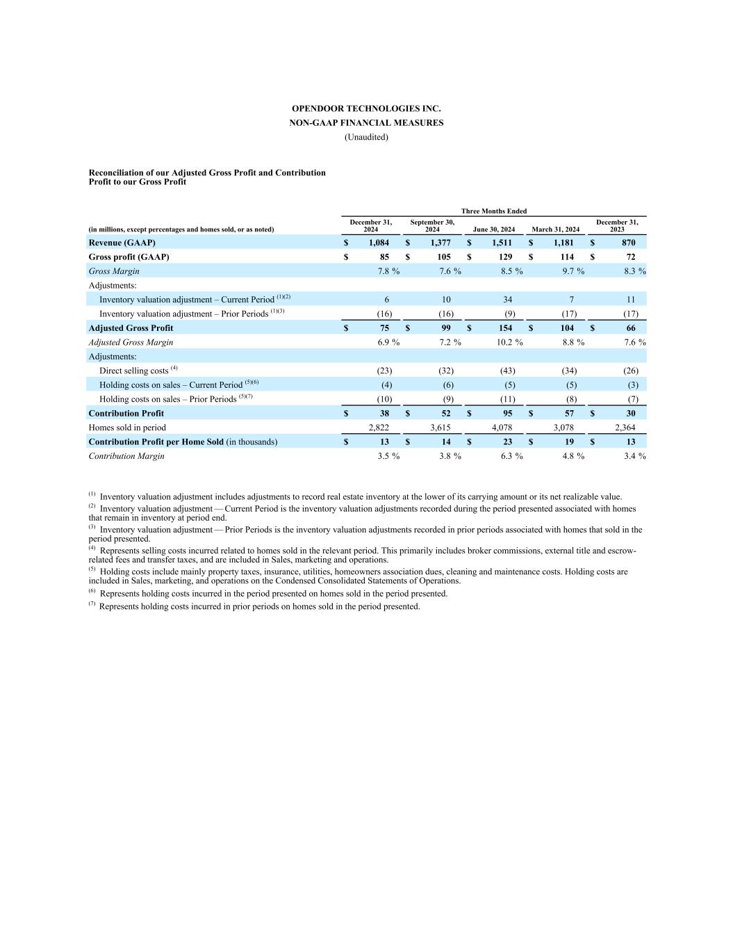 OPENDOOR TECHNOLOGIES INC. NON-GAAP FINANCIAL MEASURES (Unaudited) Reconciliation of our Adjusted Gross Profit and Contribution Profit to our Gross Profit Three Months Ended (in millions, except percentages and homes sold, or as noted) December 31, 2024 September 30, 2024 June 30, 2024 March 31, 2024 December 31, 2023 Revenue (GAAP) $ 1,084 $ 1,377 $ 1,511 $ 1,181 $ 870 Gross profit (GAAP) $ 85 $ 105 $ 129 $ 114 $ 72 Gross Margin 7.8 % 7.6 % 8.5 % 9.7 % 8.3 % Adjustments: Inventory valuation adjustment – Current Period͏ (1)(2) 6 10 34 7 11 Inventory valuation adjustment – Prior Periods͏ (1)(3) (16) (16) (9) (17) (17) Adjusted Gross Profit $ 75 $ 99 $ 154 $ 104 $ 66 Adjusted Gross Margin 6.9 % 7.2 % 10.2 % 8.8 % 7.6 % Adjustments: Direct selling costs (4) (23) (32) (43) (34) (26) Holding costs on sales – Current Period͏ (5)(6) (4) (6) (5) (5) (3) Holding costs on sales – Prior Periods͏ (5)(7) (10) (9) (11) (8) (7) Contribution Profit $ 38 $ 52 $ 95 $ 57 $ 30 Homes sold in period 2,822 3,615 4,078 3,078 2,364 Contribution Profit per Home Sold (in thousands) $ 13 $ 14 $ 23 $ 19 $ 13 Contribution Margin 3.5 % 3.8 % 6.3 % 4.8 % 3.4 % (1) Inventory valuation adjustment includes adjustments to record real estate inventory at the lower of its carrying amount or its net realizable value. (2) Inventory valuation adjustment — Current Period is the inventory valuation adjustments recorded during the period presented associated with homes that remain in inventory at period end. (3) Inventory valuation adjustment — Prior Periods is the inventory valuation adjustments recorded in prior periods associated with homes that sold in the period presented. (4) Represents selling costs incurred related to homes sold in the relevant period. This primarily includes broker commissions, external title and escrow- related fees and transfer taxes, and are included in Sales, marketing and operations. (5) Holding costs include mainly property taxes, insurance, utilities, homeowners association dues, cleaning and maintenance costs. Holding costs are included in Sales, marketing, and operations on the Condensed Consolidated Statements of Operations. (6) Represents holding costs incurred in the period presented on homes sold in the period presented. (7) Represents holding costs incurred in prior periods on homes sold in the period presented.