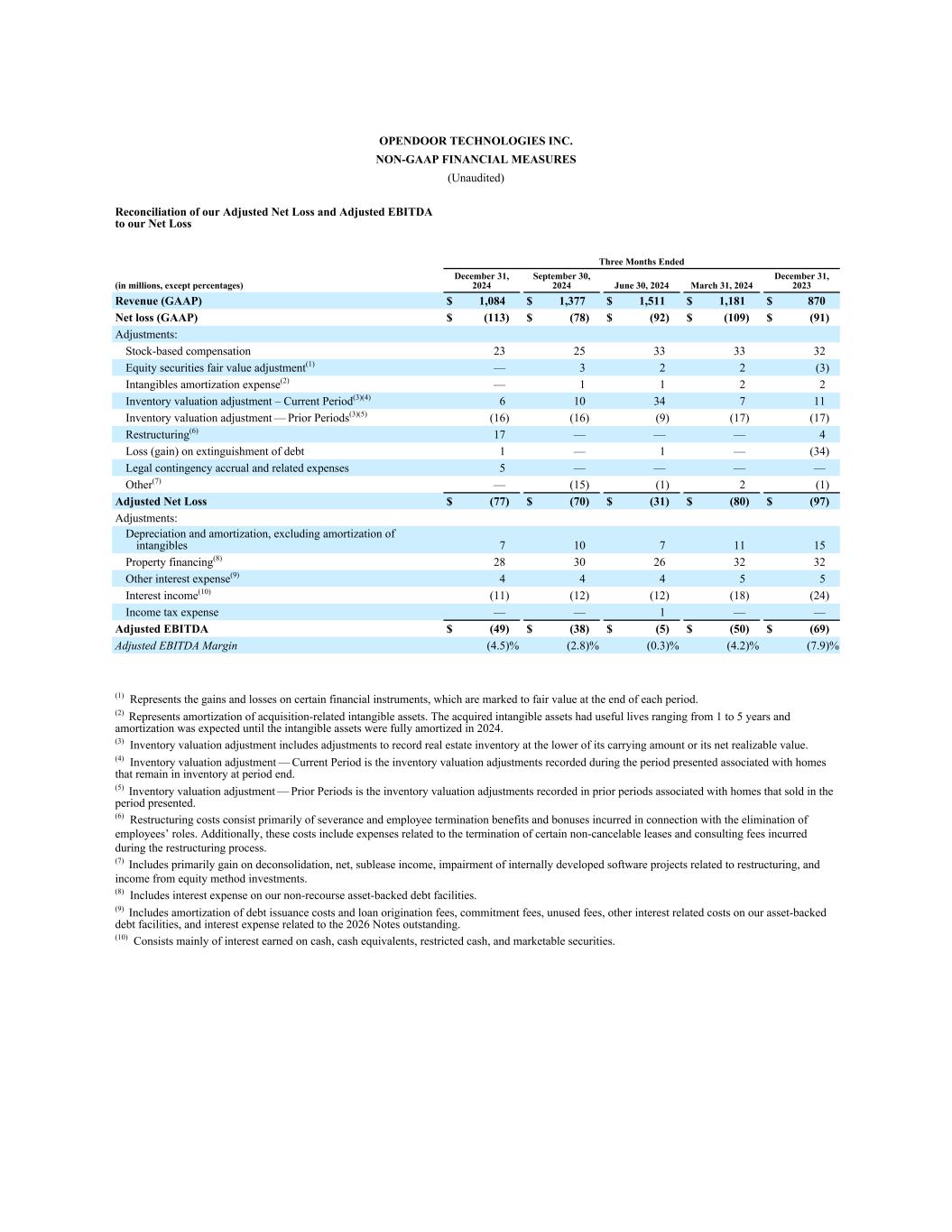 OPENDOOR TECHNOLOGIES INC. NON-GAAP FINANCIAL MEASURES (Unaudited) Reconciliation of our Adjusted Net Loss and Adjusted EBITDA to our Net Loss Three Months Ended (in millions, except percentages) December 31, 2024 September 30, 2024 June 30, 2024 March 31, 2024 December 31, 2023 Revenue (GAAP) $ 1,084 $ 1,377 $ 1,511 $ 1,181 $ 870 Net loss (GAAP) $ (113) $ (78) $ (92) $ (109) $ (91) Adjustments: Stock-based compensation 23 25 33 33 32 Equity securities fair value adjustment(1) — 3 2 2 (3) Intangibles amortization expense(2) — 1 1 2 2 Inventory valuation adjustment – Current Period͏(3)(4) 6 10 34 7 11 Inventory valuation adjustment — Prior Periods͏(3)(5) (16) (16) (9) (17) (17) Restructuring(6) 17 — — — 4 Loss (gain) on extinguishment of debt 1 — 1 — (34) Legal contingency accrual and related expenses 5 — — — — Other(7) — (15) (1) 2 (1) Adjusted Net Loss $ (77) $ (70) $ (31) $ (80) $ (97) Adjustments: Depreciation and amortization, excluding amortization of intangibles 7 10 7 11 15 Property financing(8) 28 30 26 32 32 Other interest expense(9) 4 4 4 5 5 Interest income(10) (11) (12) (12) (18) (24) Income tax expense — — 1 — — Adjusted EBITDA $ (49) $ (38) $ (5) $ (50) $ (69) Adjusted EBITDA Margin (4.5) % (2.8) % (0.3) % (4.2) % (7.9) % (1) Represents the gains and losses on certain financial instruments, which are marked to fair value at the end of each period. (2) Represents amortization of acquisition-related intangible assets. The acquired intangible assets had useful lives ranging from 1 to 5 years and amortization was expected until the intangible assets were fully amortized in 2024. (3) Inventory valuation adjustment includes adjustments to record real estate inventory at the lower of its carrying amount or its net realizable value. (4) Inventory valuation adjustment — Current Period is the inventory valuation adjustments recorded during the period presented associated with homes that remain in inventory at period end. (5) Inventory valuation adjustment — Prior Periods is the inventory valuation adjustments recorded in prior periods associated with homes that sold in the period presented. (6) Restructuring costs consist primarily of severance and employee termination benefits and bonuses incurred in connection with the elimination of employees’ roles. Additionally, these costs include expenses related to the termination of certain non-cancelable leases and consulting fees incurred during the restructuring process. (7) Includes primarily gain on deconsolidation, net, sublease income, impairment of internally developed software projects related to restructuring, and income from equity method investments. (8) Includes interest expense on our non-recourse asset-backed debt facilities. (9) Includes amortization of debt issuance costs and loan origination fees, commitment fees, unused fees, other interest related costs on our asset-backed debt facilities, and interest expense related to the 2026 Notes outstanding. (10) Consists mainly of interest earned on cash, cash equivalents, restricted cash, and marketable securities.