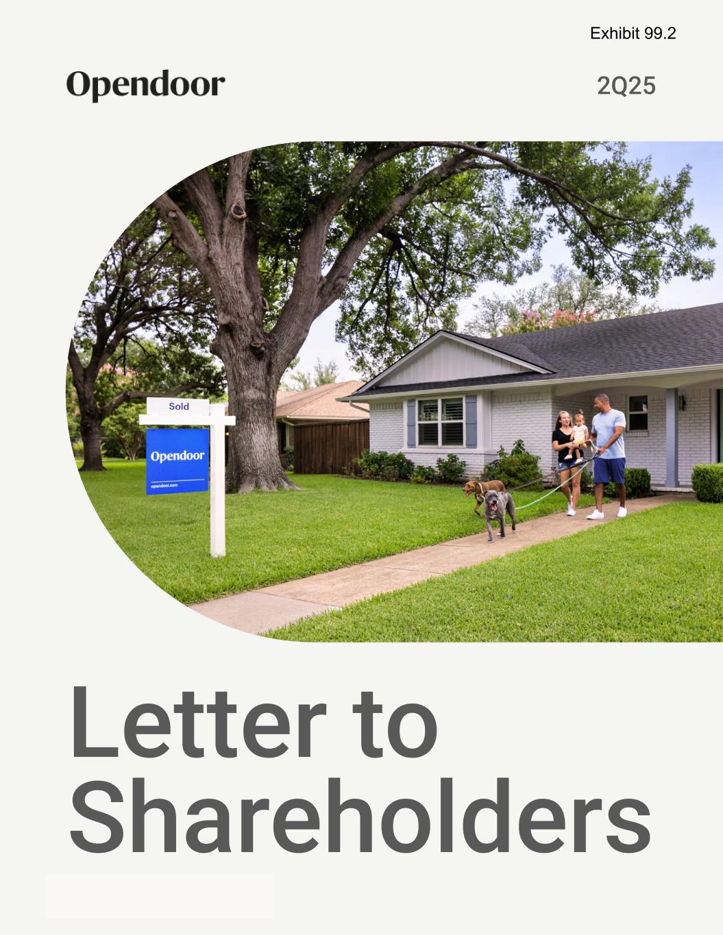 Shareholder Letter 2Q25 We delivered a strong second quarter, exceeding our guidance for both Revenue and Adjusted EBITDA. This performance reflects deliberate choices: heavier marketing spend in 4Q24 and 1Q25 to align with resale seasonality, and wider offer spreads in 2Q25 to manage risk in a volatile market. This drove higher resale volumes but lower acquisitions in the quarter, as we continue to prioritize prudence over pace — focusing on disciplined underwriting and efficient spend, rather than pursuing growth that could compromise long-term value creation. While our full quarter performance was strong, we observed a consistent slowing of the housing market as the quarter progressed. In response, we further raised spreads, exiting the quarter with a materially lower acquisition pace than we entered, which will impact our second half outlook. Looking ahead, we believe housing market weakness will persist, and we are not assuming any near-term catalyst for improvement. We expect to see sequential acquisition and resale volume declines driven by a combination of macro dynamics, typical seasonal patterns in our cash offer business, and the early-stage nature of our platform pivot, which will take time to mature. We are transitioning our business model during a historically difficult macro environment – the benefits of this evolution will take time to materialize. Still, our 2Q25 results underscore the progress we’ve made. At $1.6 billion in revenue, we achieved our first quarter of Adjusted EBITDA profitability in three years — a clear reflection of the cost discipline and operating leverage we've developed. While we don’t expect to maintain profitability in the back half given lower acquisition volume and inventory levels, this milestone is a meaningful indicator of the substantial progress we are making. This is a moment of necessary transition — one that will reposition Opendoor for durability, relevance, and scale in the years ahead. Our near-term expectations don’t reflect our ambitions. We know where we’re going, and we’re taking deliberate steps to get there. Executing Against Our Plan 4 Delivered Adjusted EBITDA of $23 million in 2Q25, compared to $(5) million in 2Q24, achieving our first quarter of Adjusted EBITDA profitability in three years. Sold 4,299 homes, which generated $1.6 billion revenue, representing a 5% increase versus 2Q24. Carrie Wheeler, Chair and CEO Delivered $128 million of gross profit, versus $129 million in 2Q24, representing an 8.2% gross margin, and $69 million of Contribution Profit, versus $95 million in 2Q24, representing a 4.4% Contribution Margin. Note: Adjusted Operating Expenses, Adjusted Gross Profit, Contribution Profit, Contribution Margin, Adjusted Net Loss, and Adjusted EBITDA are non-GAAP financial measures. See “Use of Non-GAAP Financial Measures” following the financial tables below for further details and a reconciliation of such non-GAAP measures to their nearest comparable GAAP measures. Narrowed our Net Loss to $(29) million and Adjusted Net Loss to $(9) million, versus $(92) million and $(31) million in 2Q24, respectively.