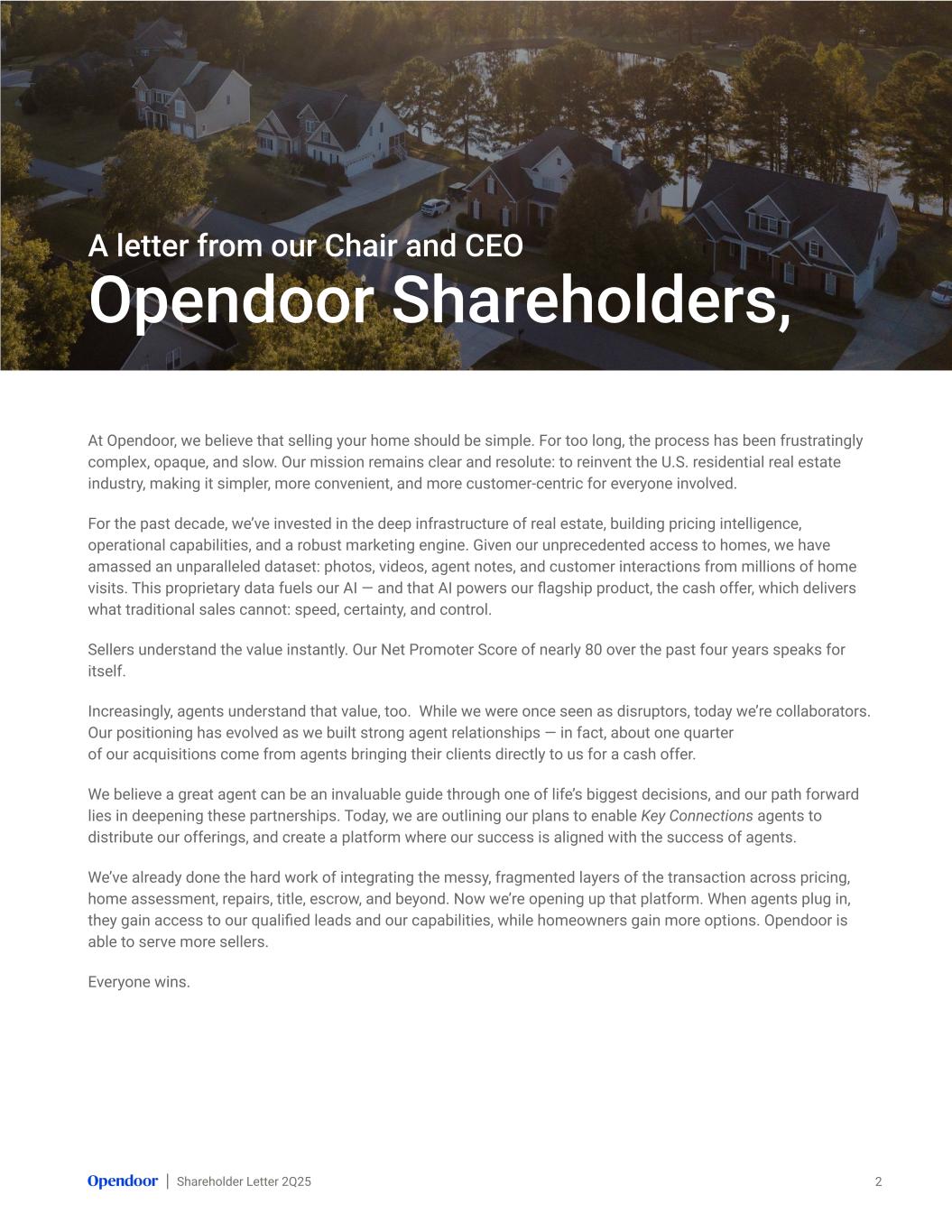 Shareholder Letter 2Q25 At Opendoor, we believe that selling your home should be simple. For too long, the process has been frustratingly complex, opaque, and slow. Our mission remains clear and resolute: to reinvent the U.S. residential real estate industry, making it simpler, more convenient, and more customer-centric for everyone involved. For the past decade, we’ve invested in the deep infrastructure of real estate, building pricing intelligence, operational capabilities, and a robust marketing engine. Given our unprecedented access to homes, we have amassed an unparalleled dataset: photos, videos, agent notes, and customer interactions from millions of home visits. This proprietary data fuels our AI — and that AI powers our flagship product, the cash offer, which delivers what traditional sales cannot: speed, certainty, and control. Sellers understand the value instantly. Our Net Promoter Score of nearly 80 over the past four years speaks for itself. Increasingly, agents understand that value, too. While we were once seen as disruptors, today we’re collaborators. Our positioning has evolved as we built strong agent relationships — in fact, about one quarter of our acquisitions come from agents bringing their clients directly to us for a cash offer. We believe a great agent can be an invaluable guide through one of life’s biggest decisions, and our path forward lies in deepening these partnerships. Today, we are outlining our plans to enable Key Connections agents to distribute our offerings, and create a platform where our success is aligned with the success of agents. We’ve already done the hard work of integrating the messy, fragmented layers of the transaction across pricing, home assessment, repairs, title, escrow, and beyond. Now we’re opening up that platform. When agents plug in, they gain access to our qualified leads and our capabilities, while homeowners gain more options. Opendoor is able to serve more sellers. Everyone wins. Opendoor Shareholders, 2 A letter from our Chair and CEO