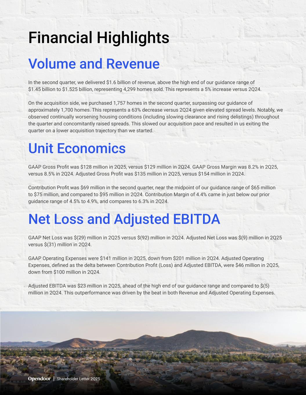 Shareholder Letter 2Q25 GAAP Net Loss was $(29) million in 2Q25 versus $(92) million in 2Q24. Adjusted Net Loss was $(9) million in 2Q25 versus $(31) million in 2Q24. GAAP Operating Expenses were $141 million in 2Q25, down from $201 million in 2Q24. Adjusted Operating Expenses, defined as the delta between Contribution Profit (Loss) and Adjusted EBITDA, were $46 million in 2Q25, down from $100 million in 2Q24. Adjusted EBITDA was $23 million in 2Q25, ahead of the high end of our guidance range and compared to $(5) million in 2Q24. This outperformance was driven by the beat in both Revenue and Adjusted Operating Expenses. GAAP Gross Profit was $128 million in 2Q25, versus $129 million in 2Q24. GAAP Gross Margin was 8.2% in 2Q25, versus 8.5% in 2Q24. Adjusted Gross Profit was $135 million in 2Q25, versus $154 million in 2Q24. Contribution Profit was $69 million in the second quarter, near the midpoint of our guidance range of $65 million to $75 million, and compared to $95 million in 2Q24. Contribution Margin of 4.4% came in just below our prior guidance range of 4.5% to 4.9%, and compares to 6.3% in 2Q24. In the second quarter, we delivered $1.6 billion of revenue, above the high end of our guidance range of $1.45 billion to $1.525 billion, representing 4,299 homes sold. This represents a 5% increase versus 2Q24. On the acquisition side, we purchased 1,757 homes in the second quarter, surpassing our guidance of approximately 1,700 homes. This represents a 63% decrease versus 2Q24 given elevated spread levels. Notably, we observed continually worsening housing conditions (including slowing clearance and rising delistings) throughout the quarter and concomitantly raised spreads. This slowed our acquisition pace and resulted in us exiting the quarter on a lower acquisition trajectory than we started. Financial Highlights Volume and Revenue Unit Economics Net Loss and Adjusted EBITDA